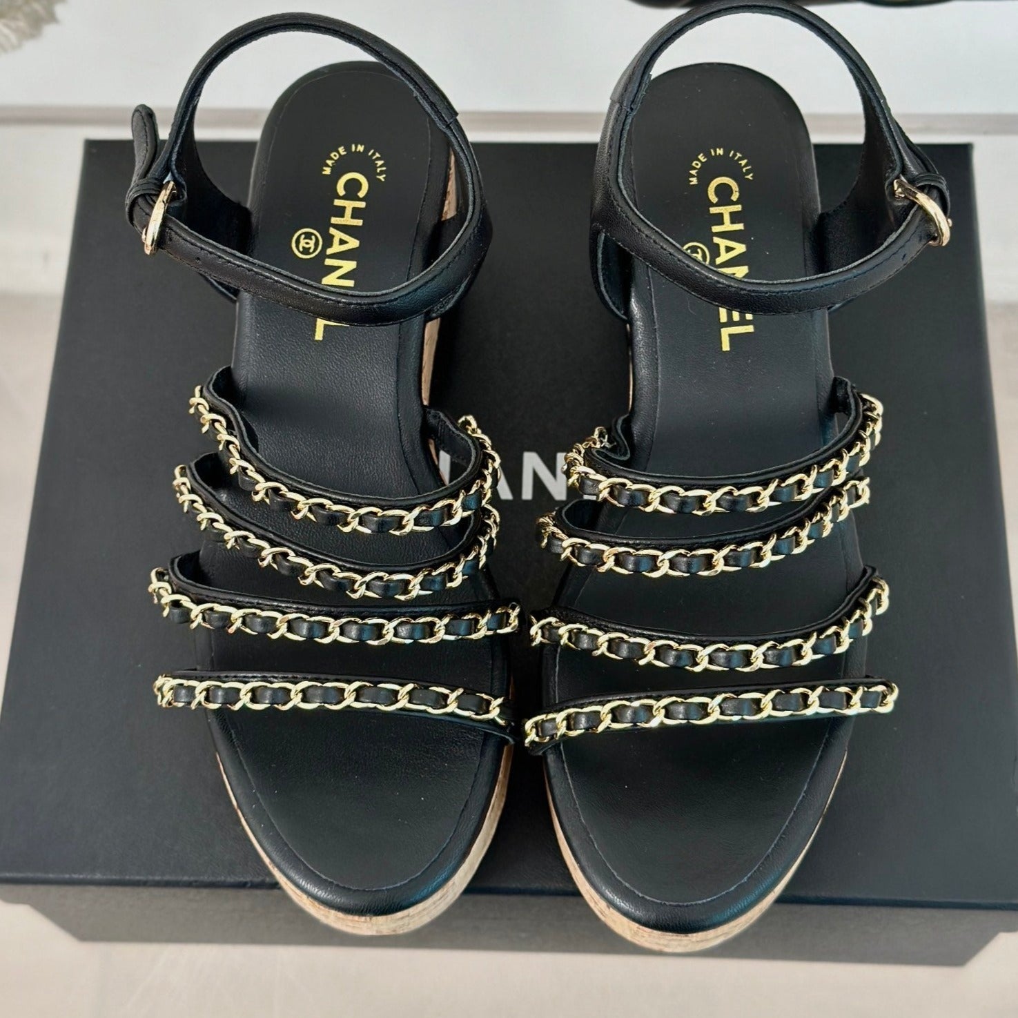 Double C Wooden Chain Platform Block Heel Sandals Black