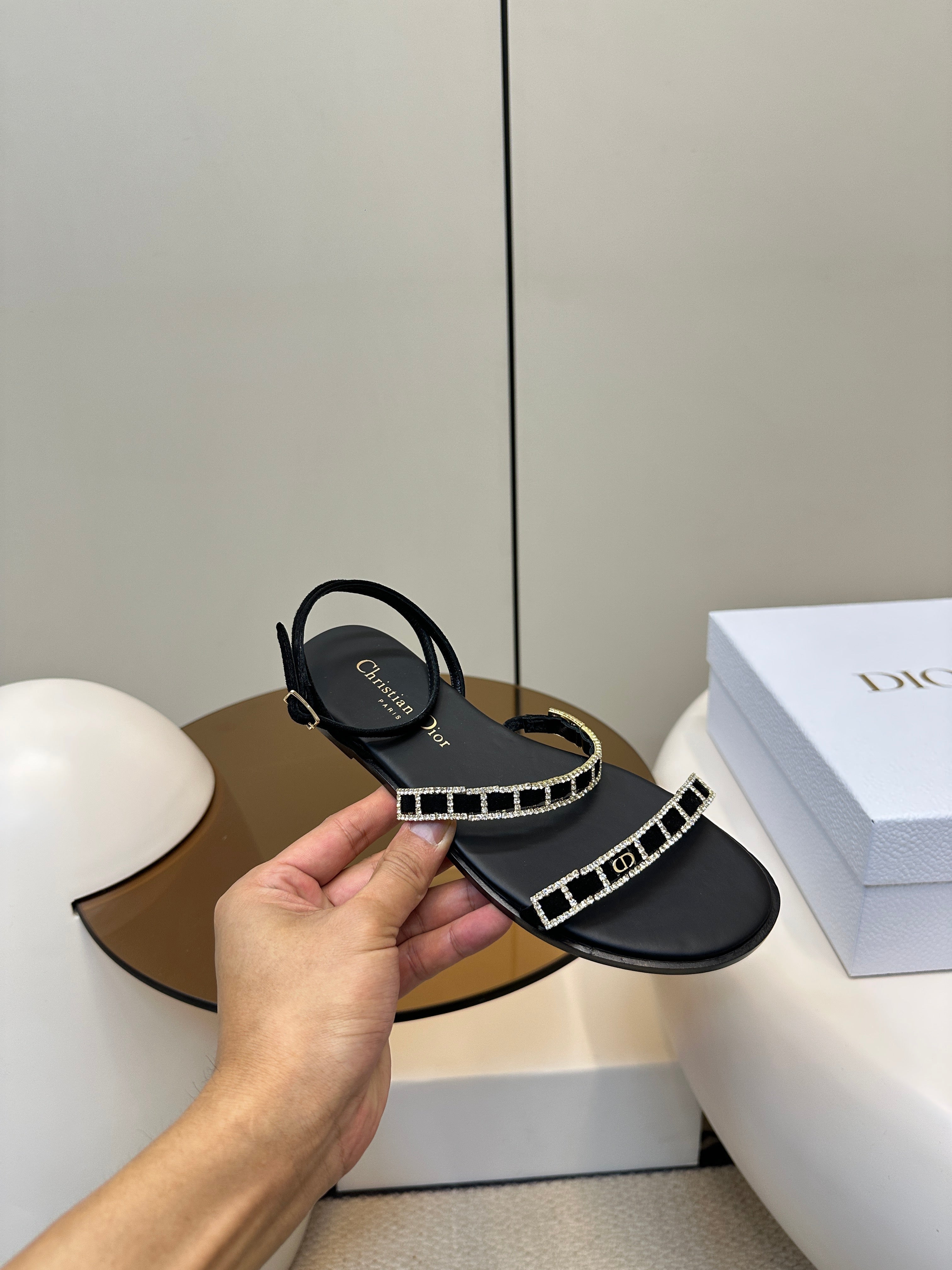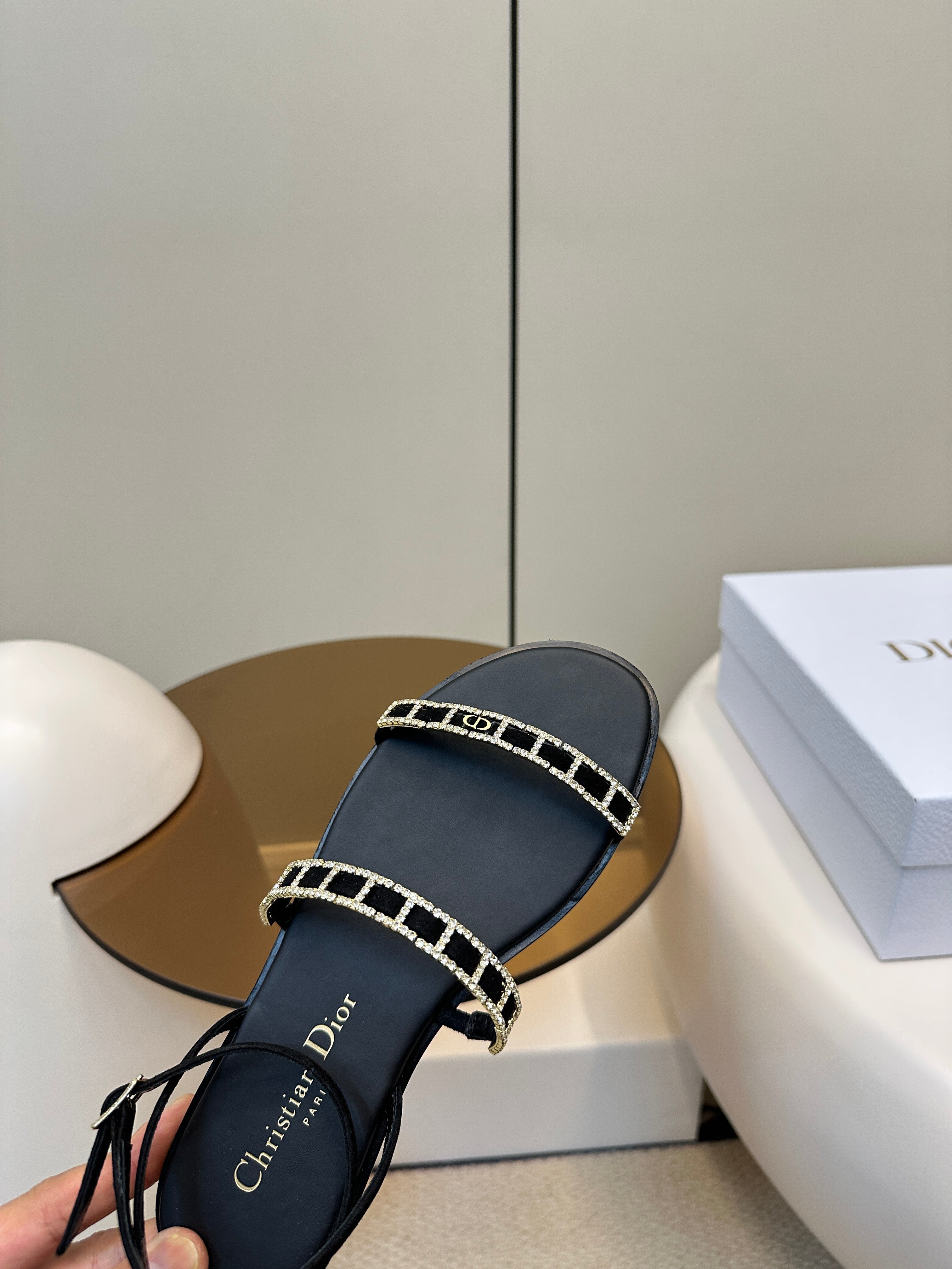 FLAT SANDALS 25S IN BLACK CALFSKIN RHINESTONES STRAP
