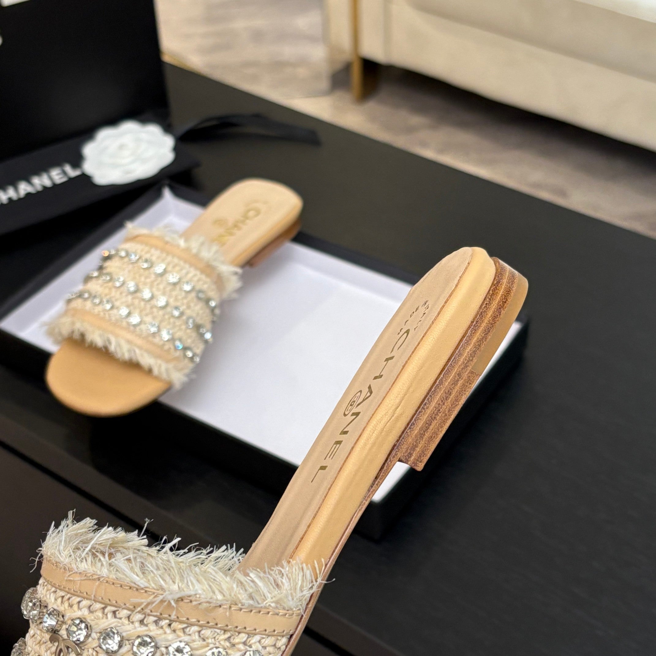 • Material: Custom Chanel factory material with pearl accents