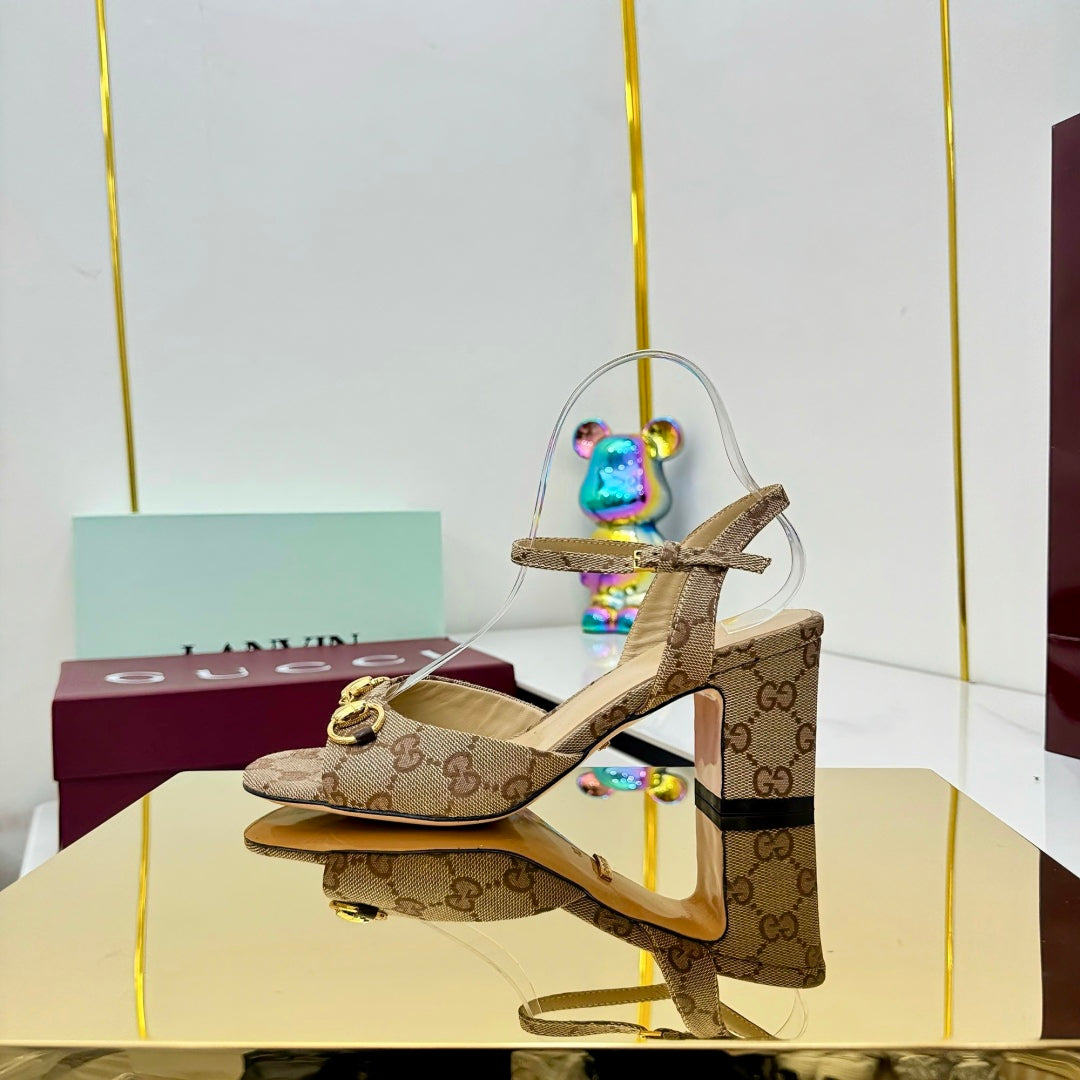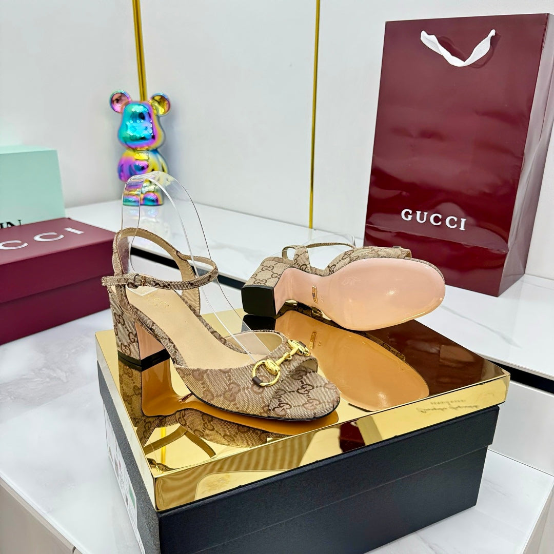 GG HEELED SANDALS 25S 65 MM IN DARK BEIGE CANVAS WITH GOLD HARDWARE