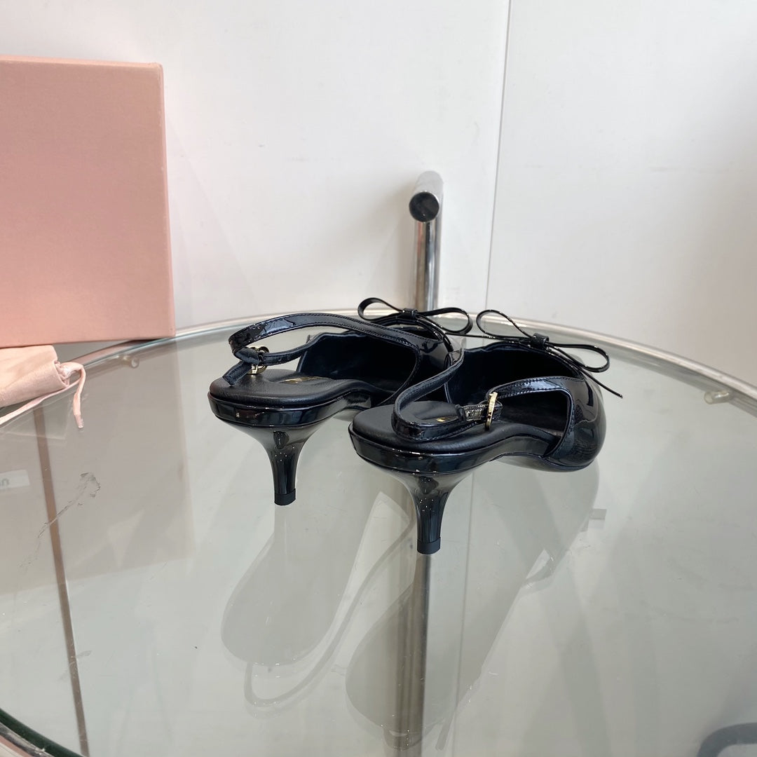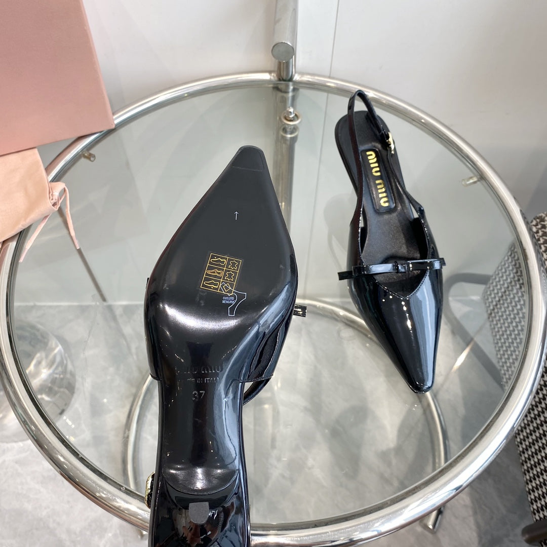 HIGH-SLINGBACK POINTED TOE SANDALS BLACK COWHIDE WITH BOW