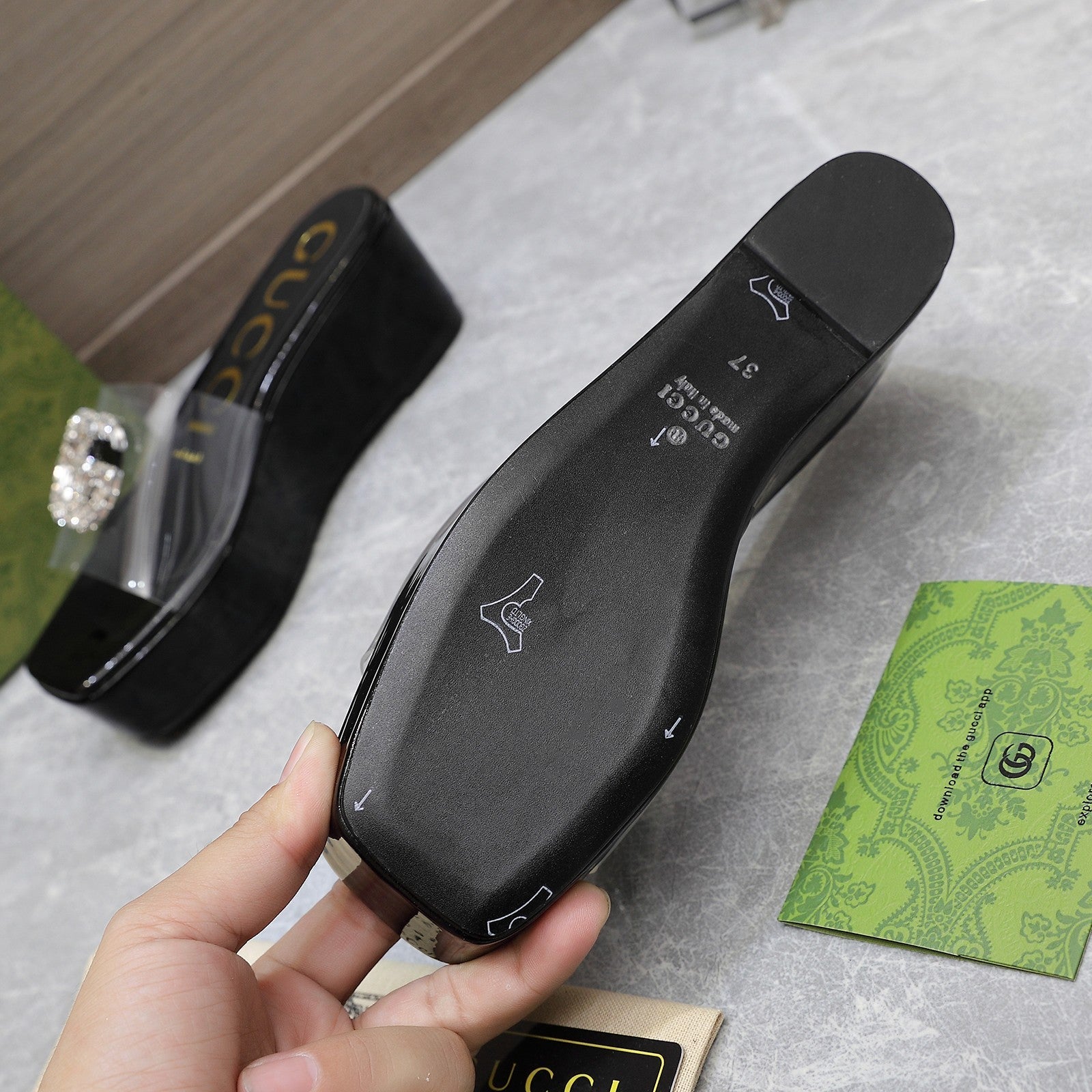 HIGH WEDGE PLATFORM IN BLACK GLOSSY CALFSKIN WITH DOUBLE CRYSTAL G BUCKLE