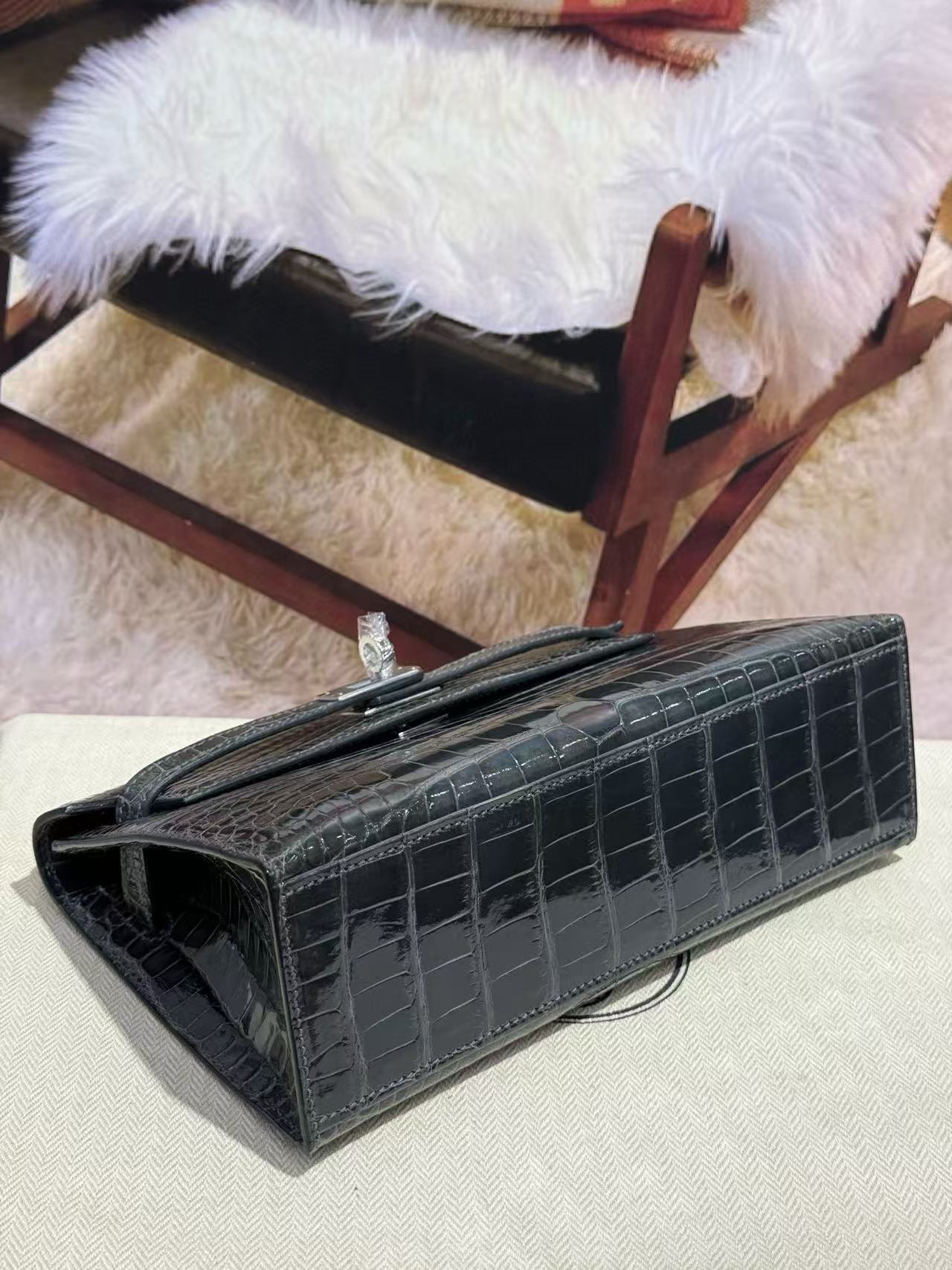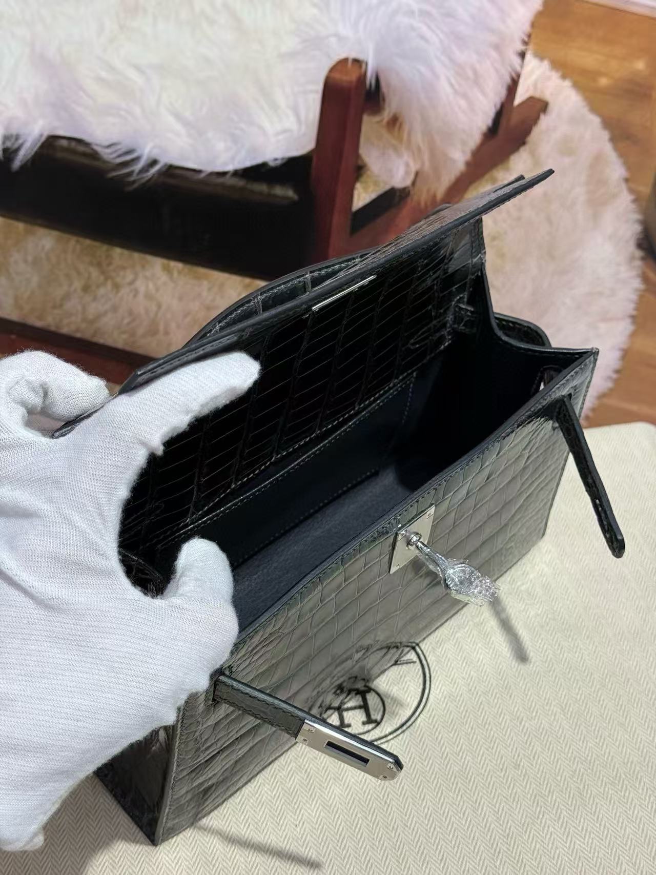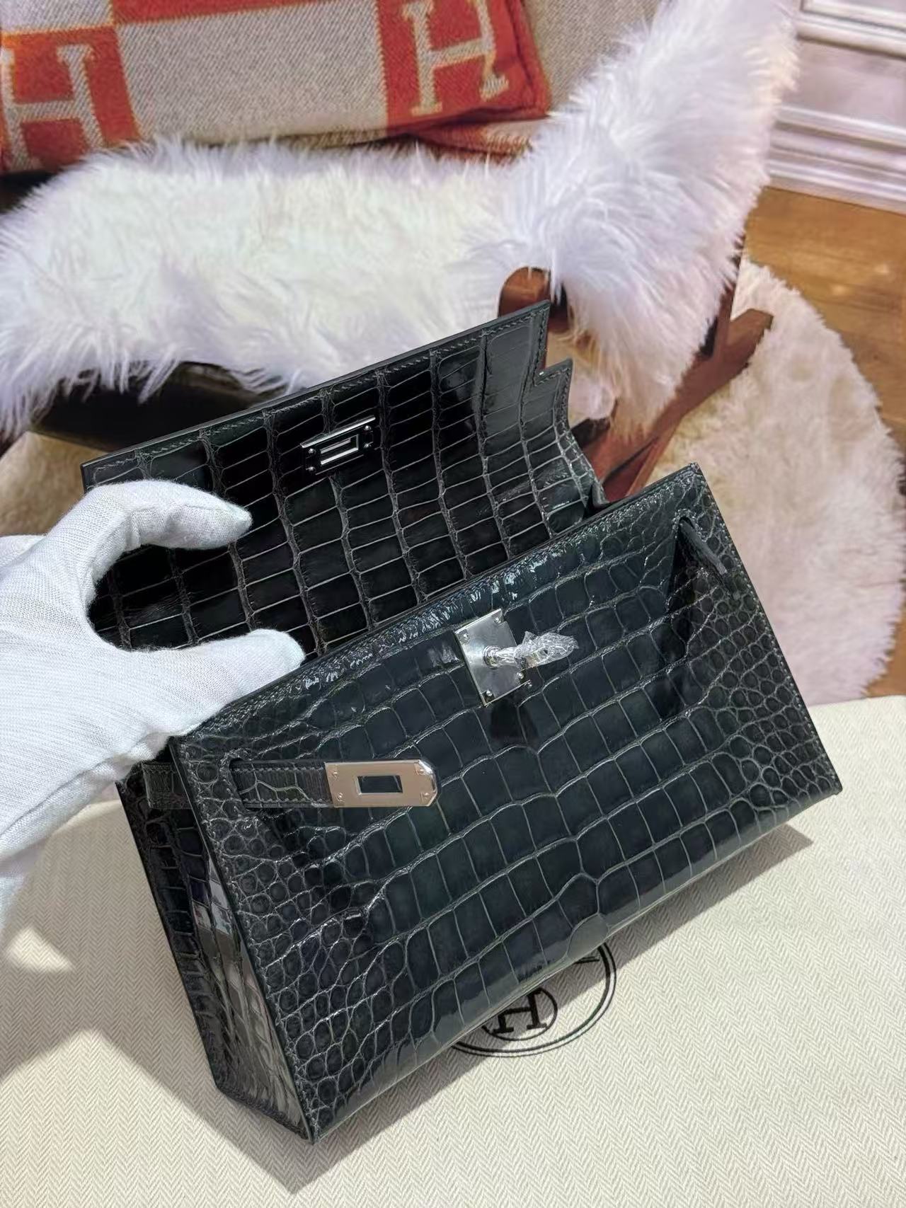 HM KELLY MINI 22 IN BLACK AMERICAN ALLIGATOR SILVER BUCKLE