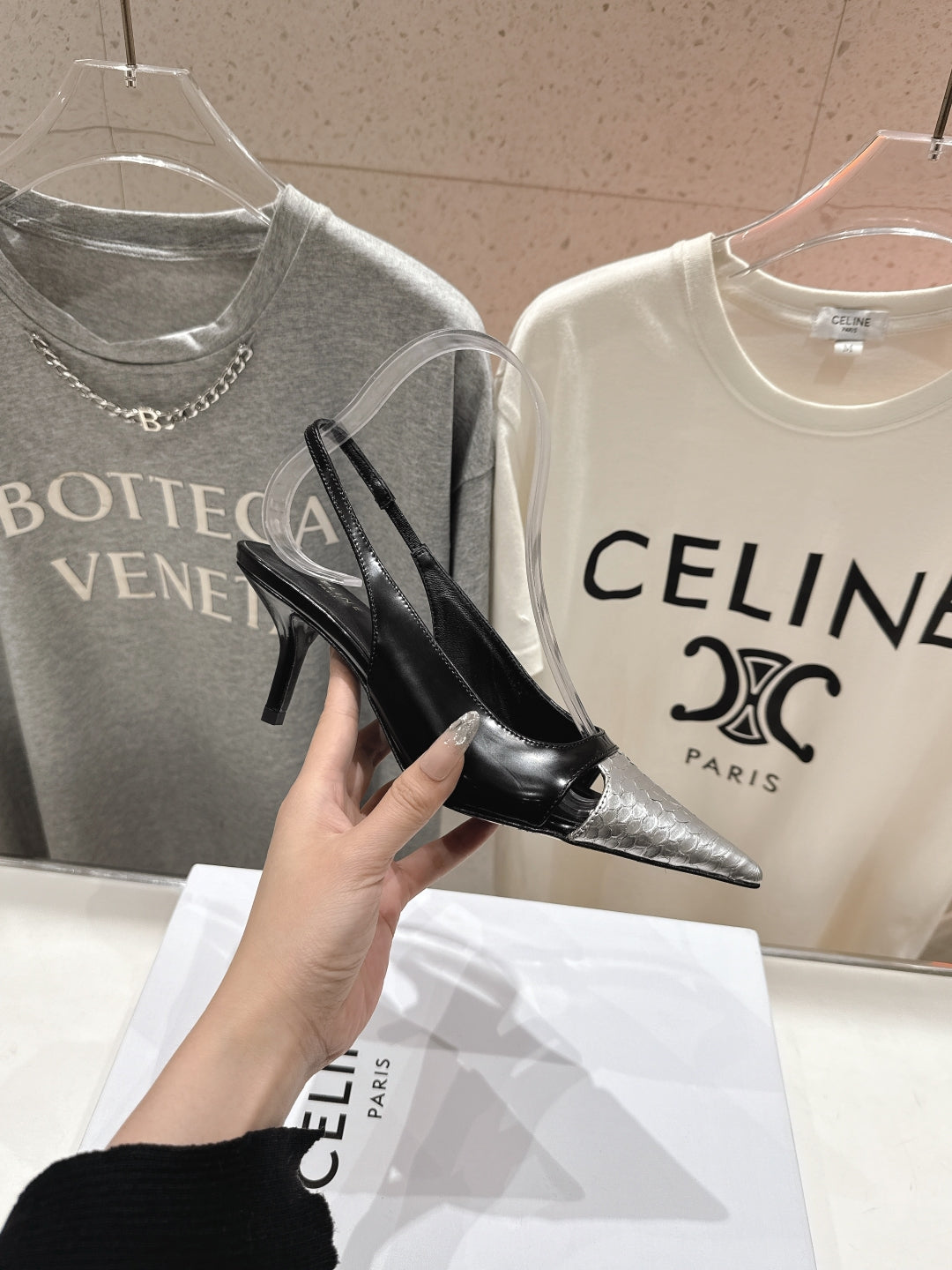 JUDY CAP TOE SLINGBACK 65MM IN BLACK SHINY CALFSKIN AND SILVER SNAKE EMBOSSED LEATHER