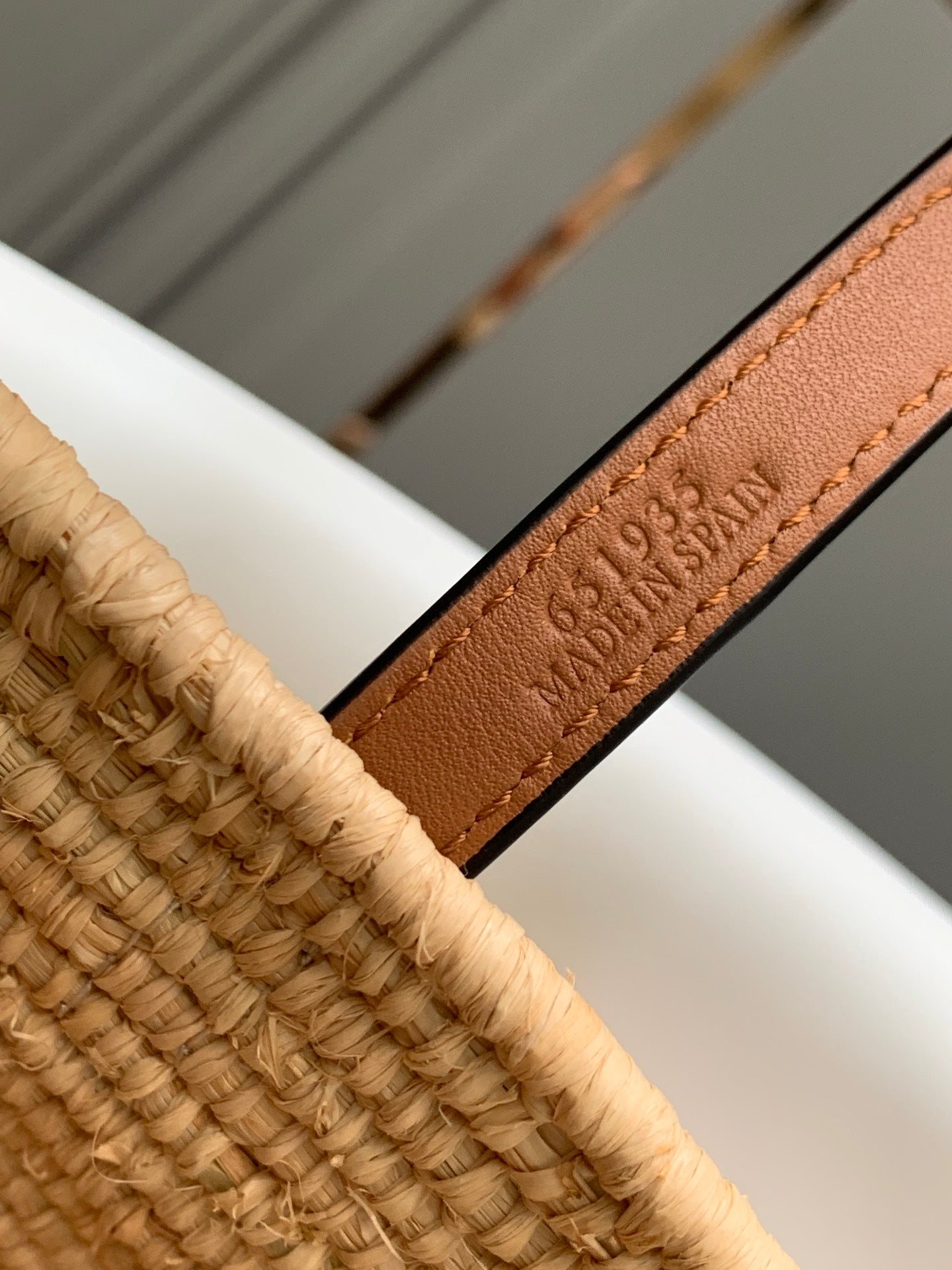 LOEWE 25S BASKET BAG 30 IN NATURAL MIX BROWN RAFFIA CALFSKIN SHOULDER STRAP