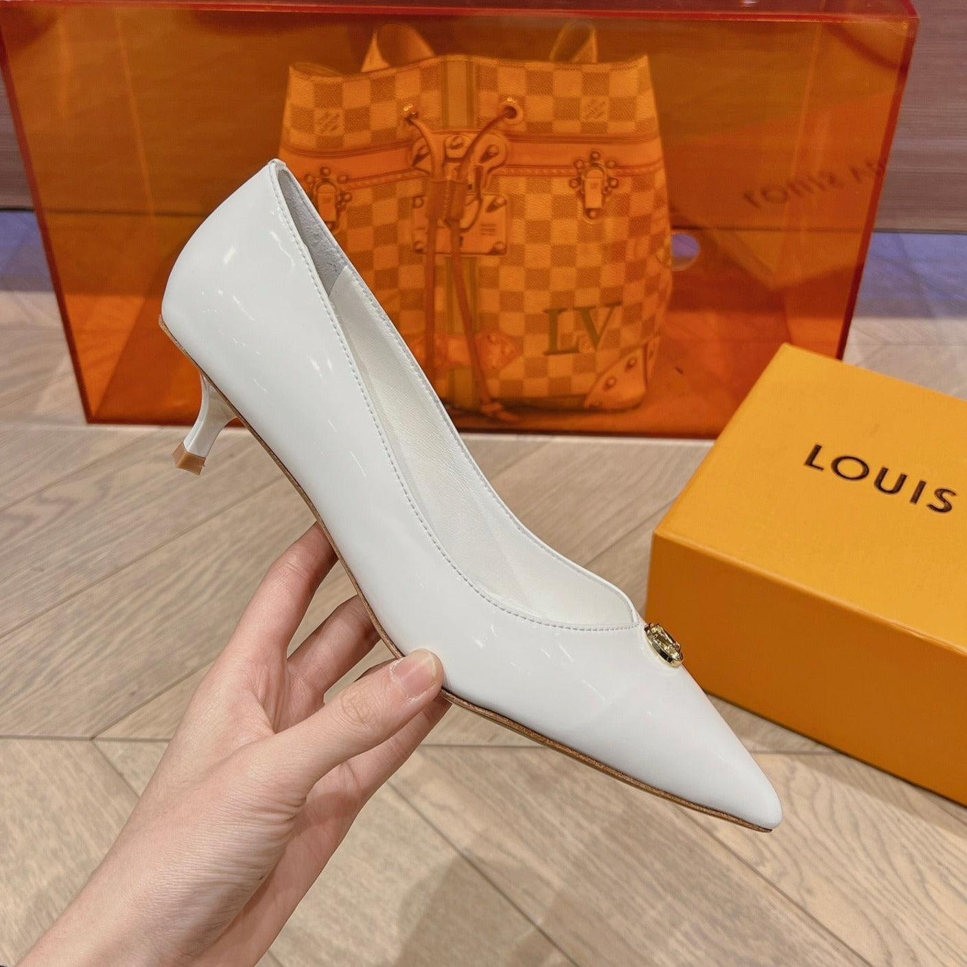 LV SINGLE LOW HEEL PUMP WHITE