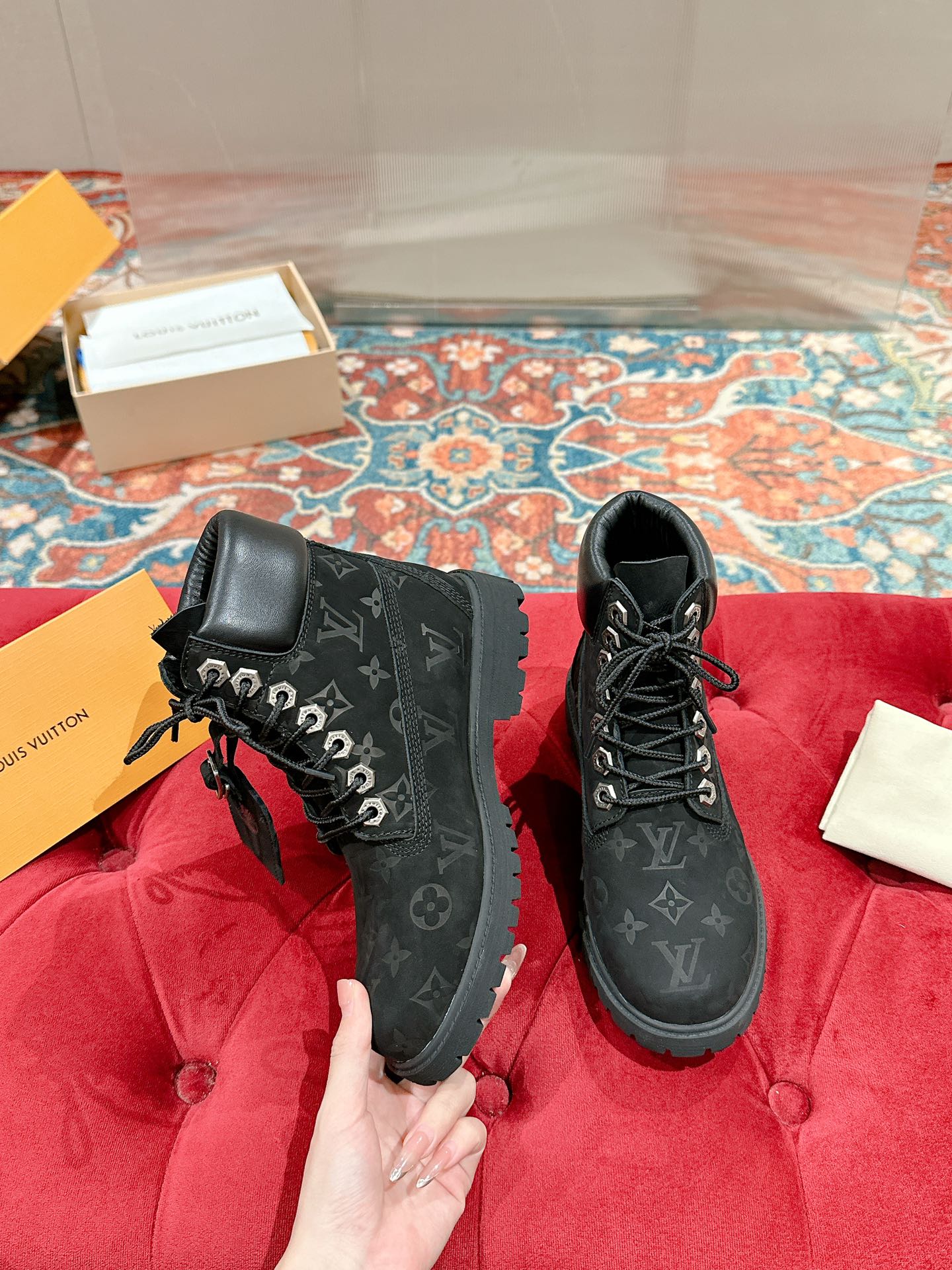 LV X TIMBERLAND ANKLE BOOT IN BLACK MONOGRAM SUEDE