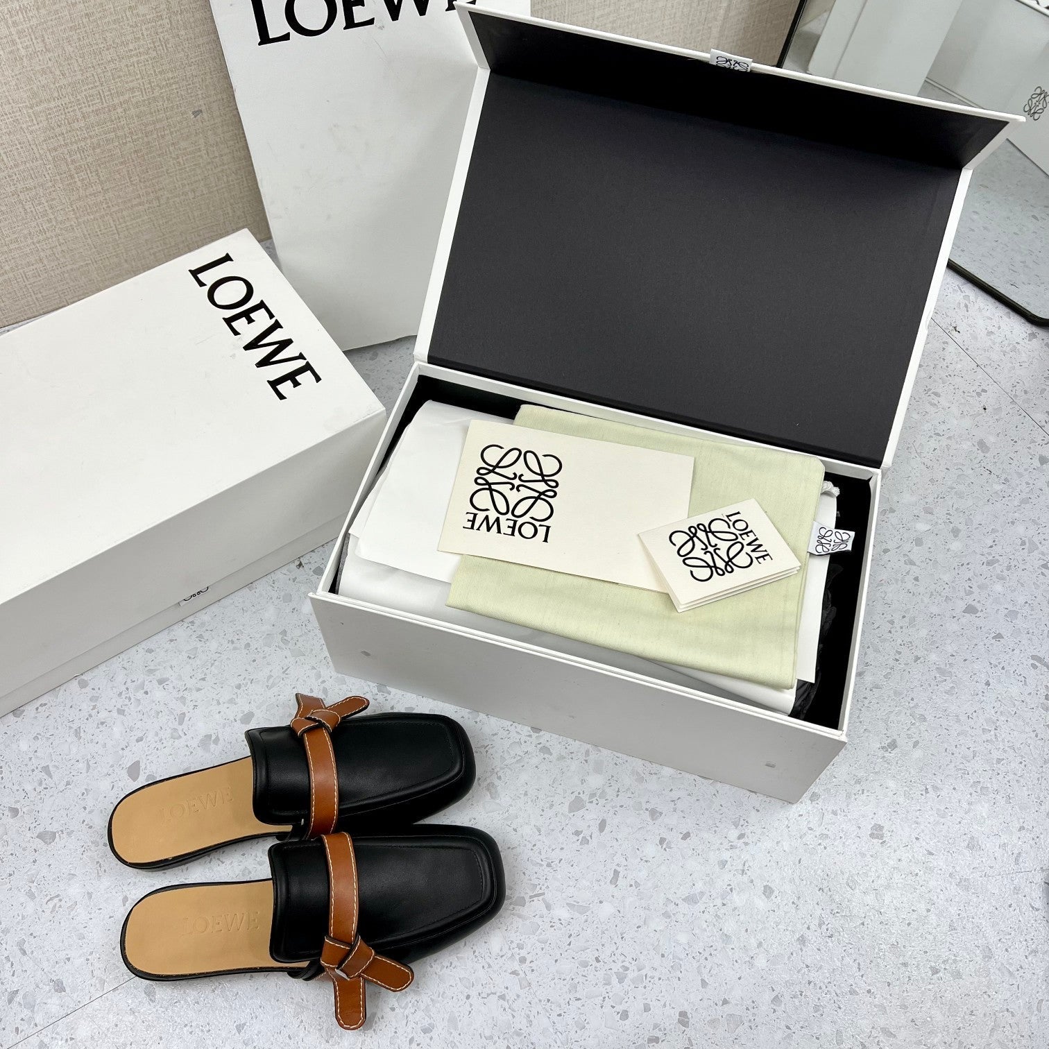 LW GATE BROWN BELTED MULE BLACK CALFSKIN