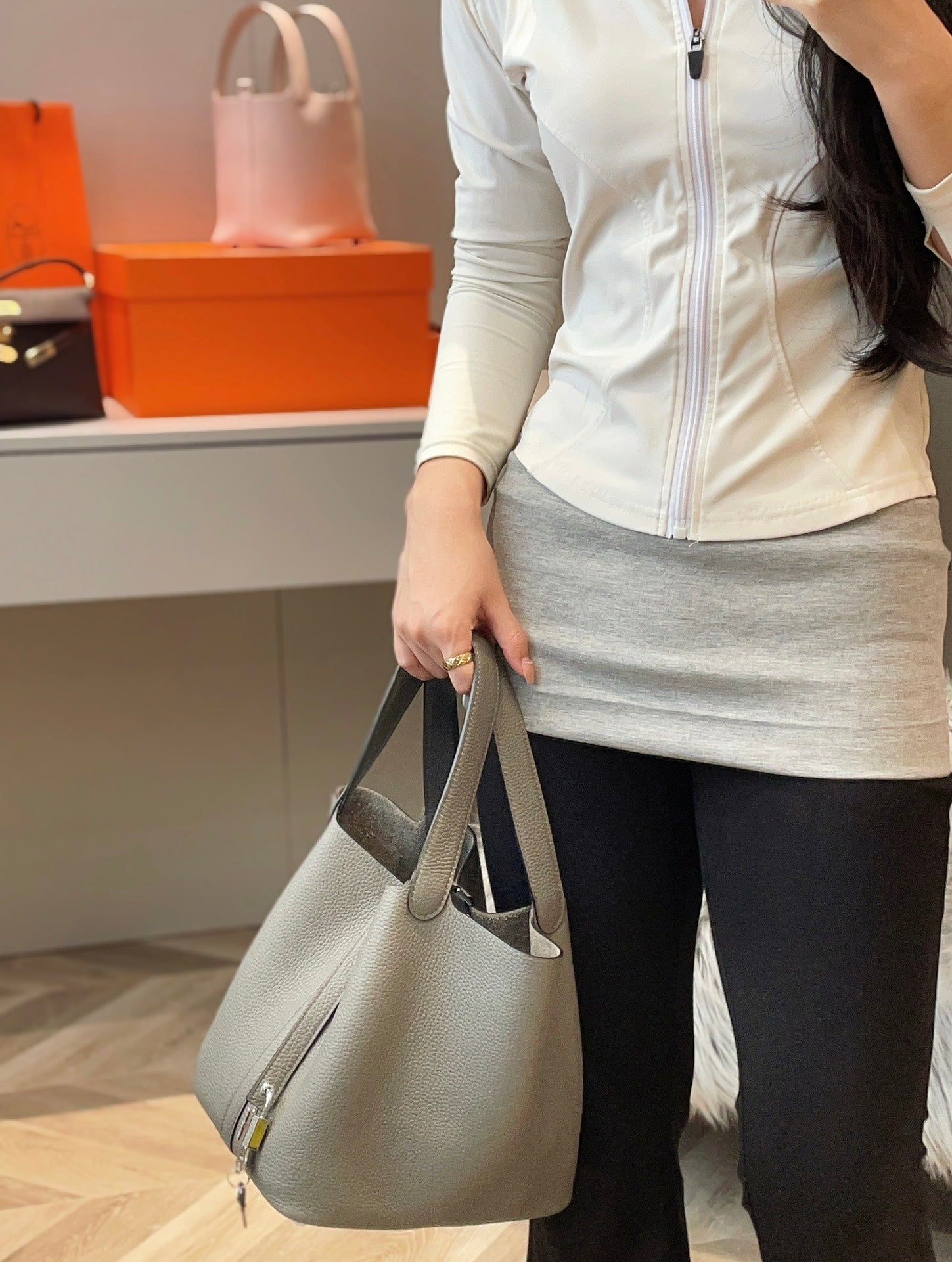 PICOTIN LOCK 22 IN GREY ETAIN CALFSKIN SILVER HARDWARE
