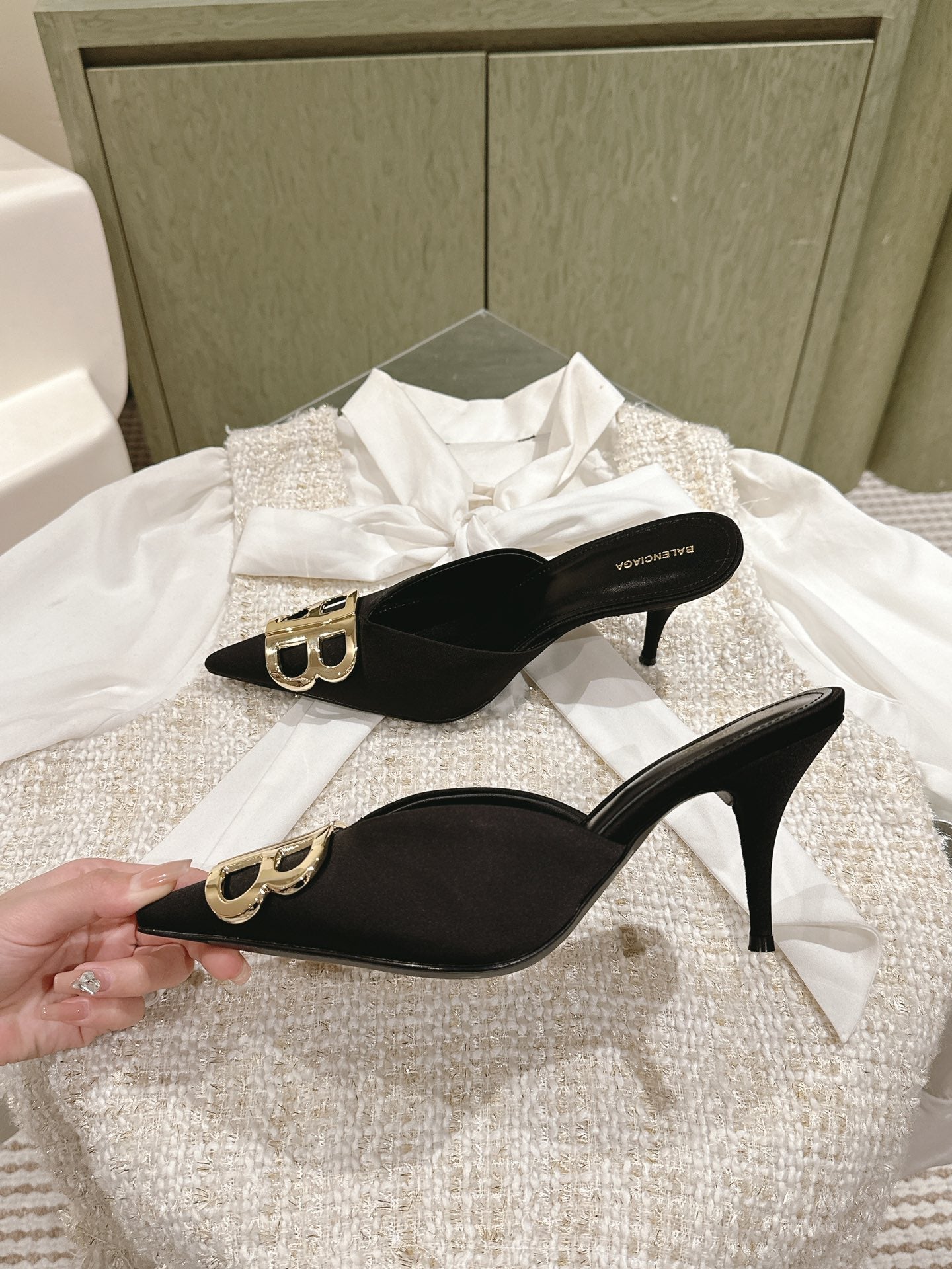 POINTED BB GOLD BUCKLE HIGH MULES IN BLACK SILK