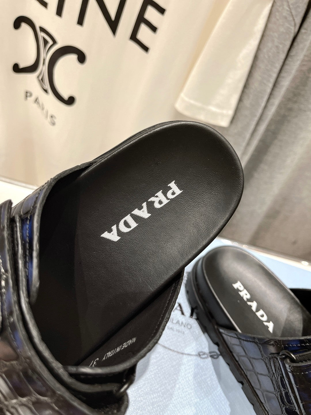 PRA CROCODILE LEATHER MOTIF SANDALS BLACK AND LAPIS CALFSKIN