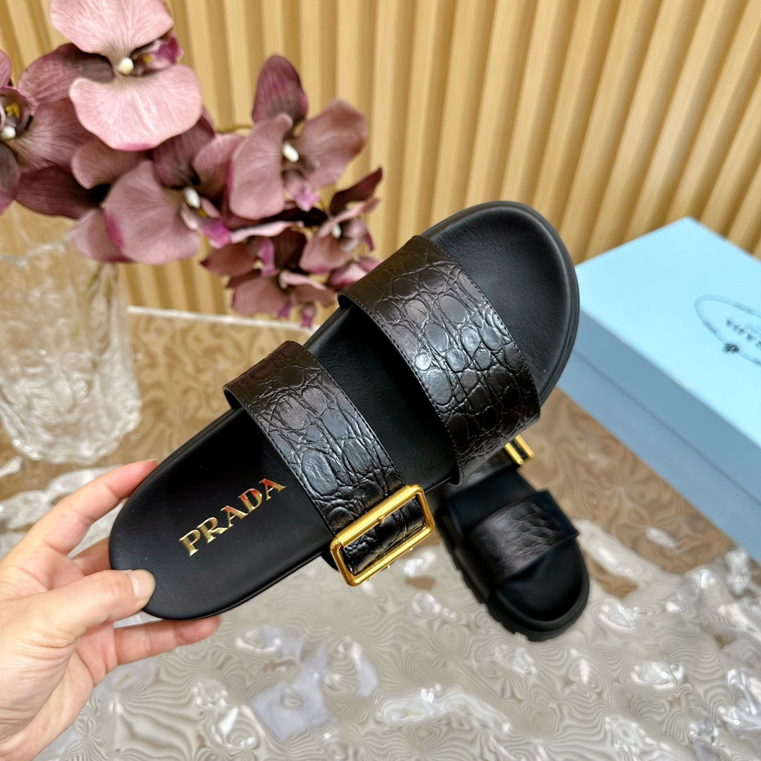 PRA CROCODILE MOTIF SLIDES SANDALS JET-BLACK CALFSKIN