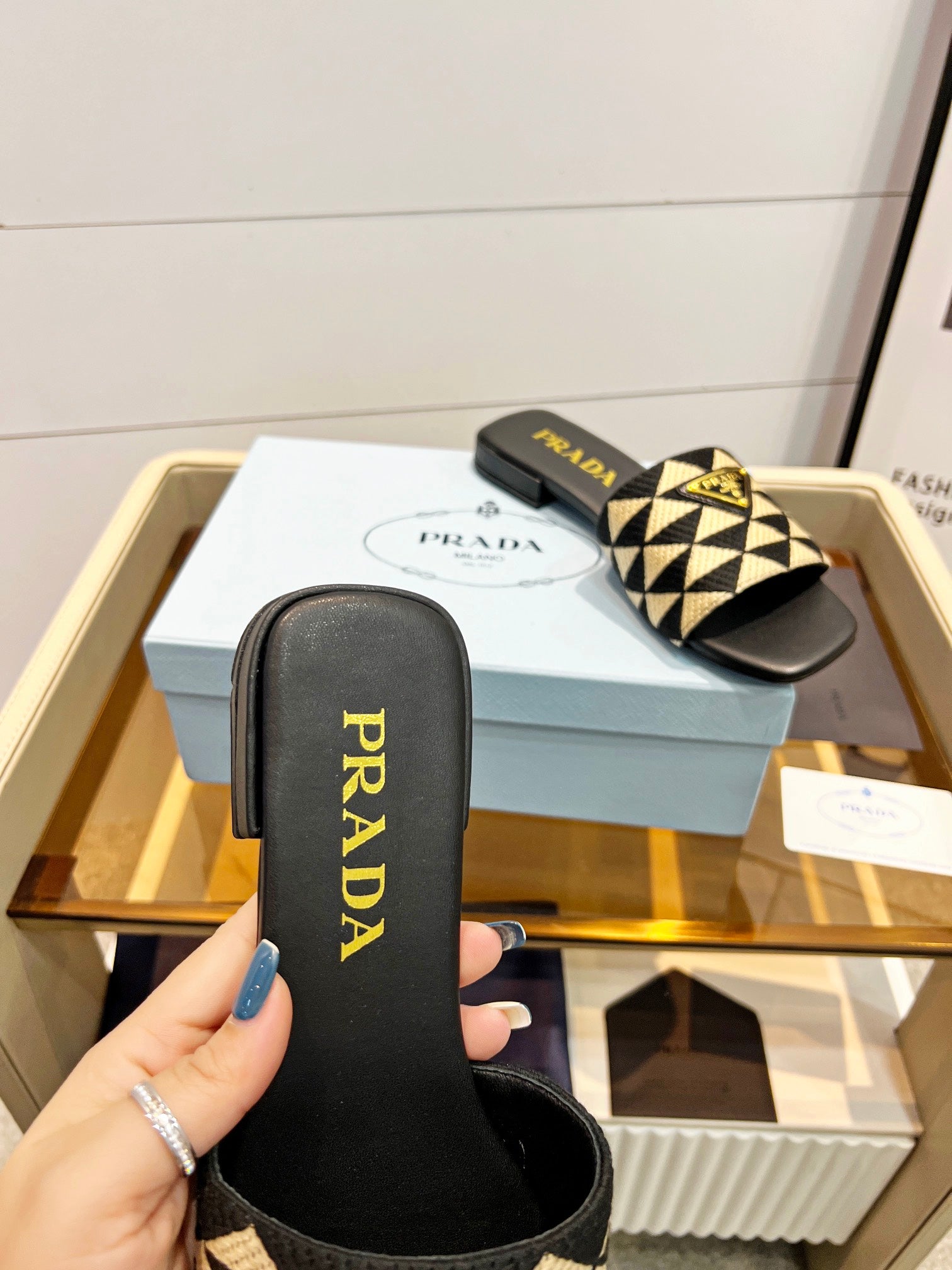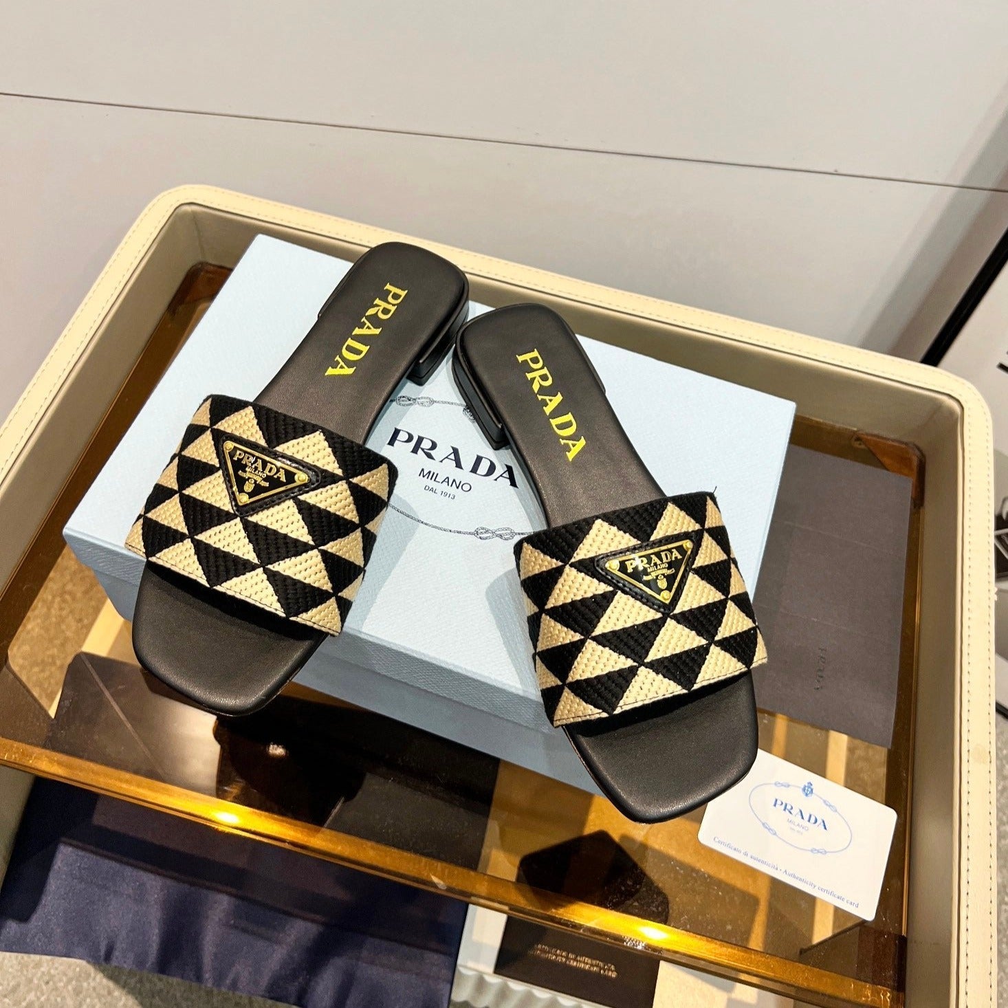 PRA EMBROIDERED SLIDES FLAT BLACK AND BEIGE FABRIC
