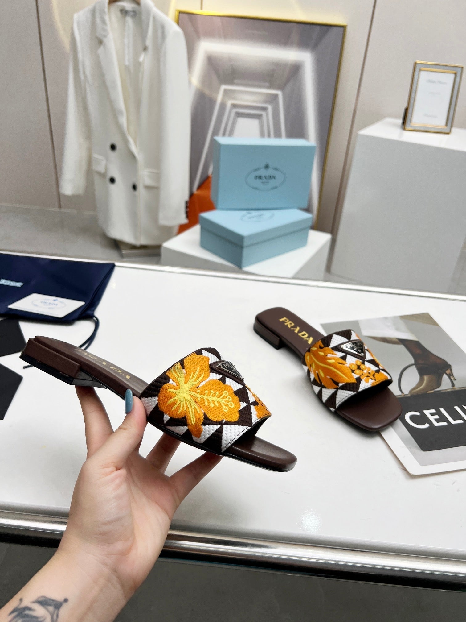 PRA EMBROIDERED SLIDES FLAT CHOCOLATE FABRIC
