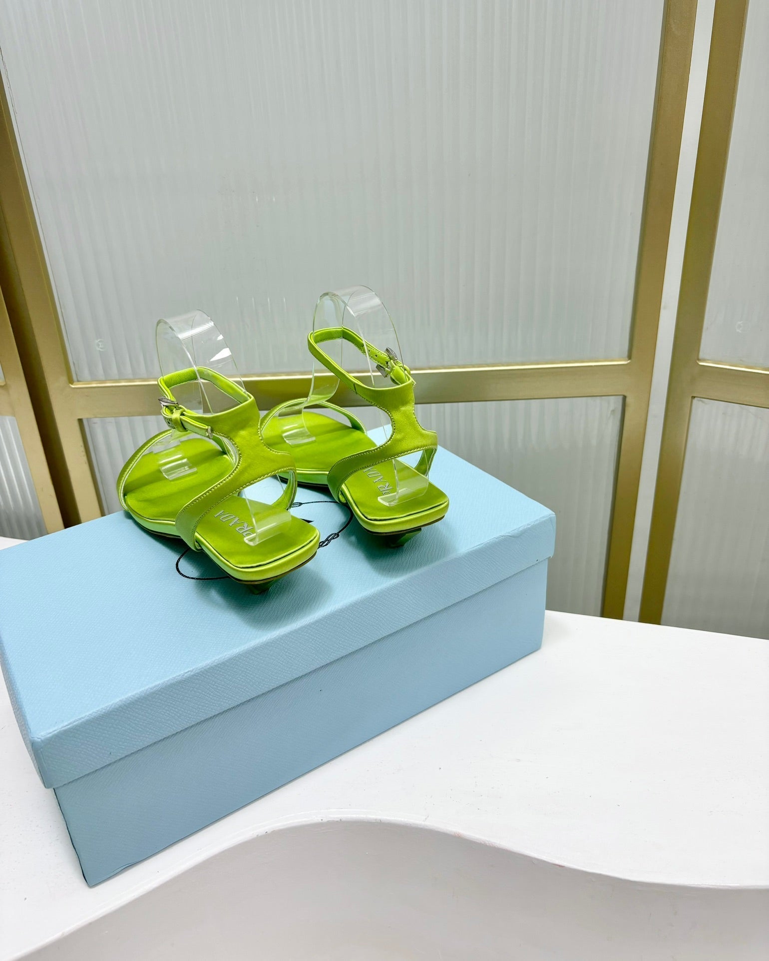 PRA TRIANGLE HEEL SATIN SANDALS CHARTREUSE