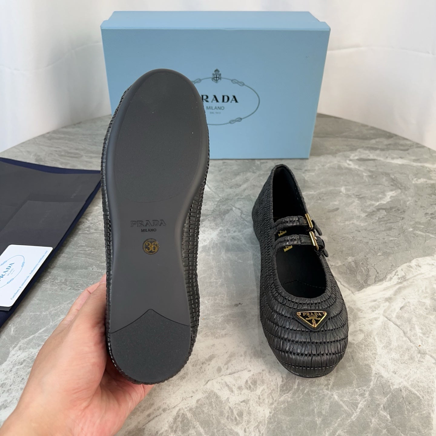 PRADA 25S BALLET FLAT IN BLACK RAFFIA AND CALFSKIN