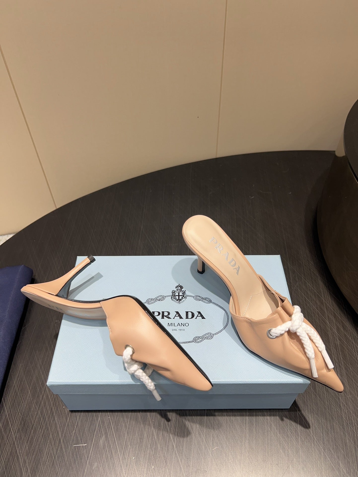 PRADA 25S BRAIDED DETAIL MULES 85MM IN BEIGE CALFSKIN