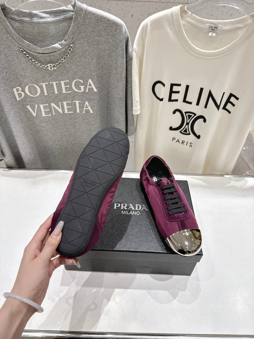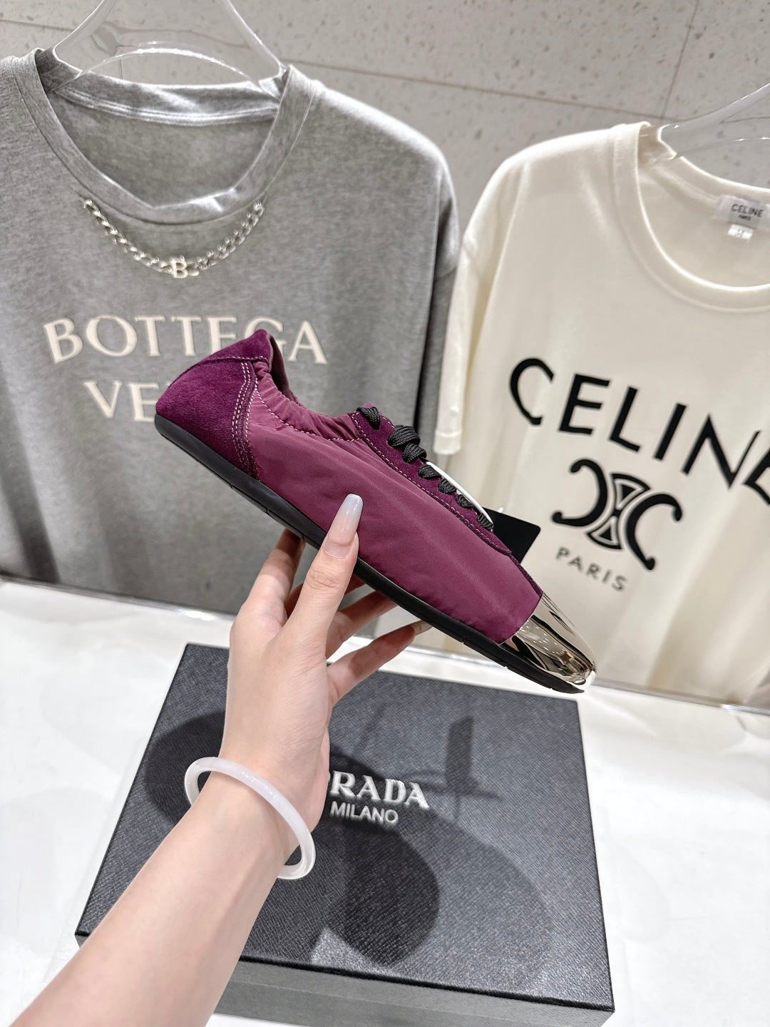 PRADA 25S COLLAPSE RE NYLON AND SUEDE SNEAKERS IN PLUM WITH METAL TOECAP