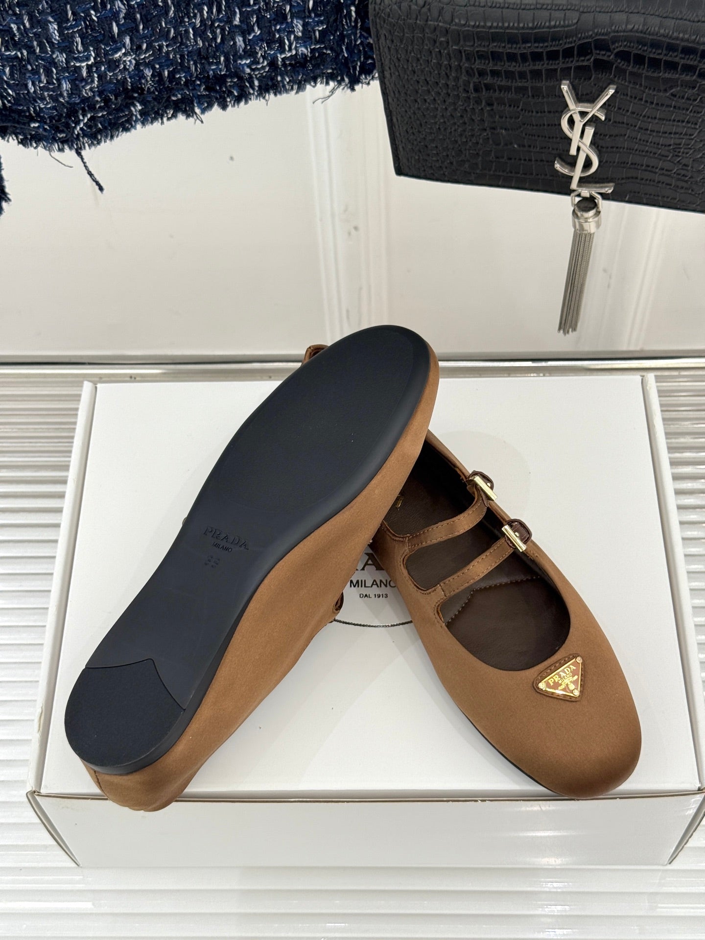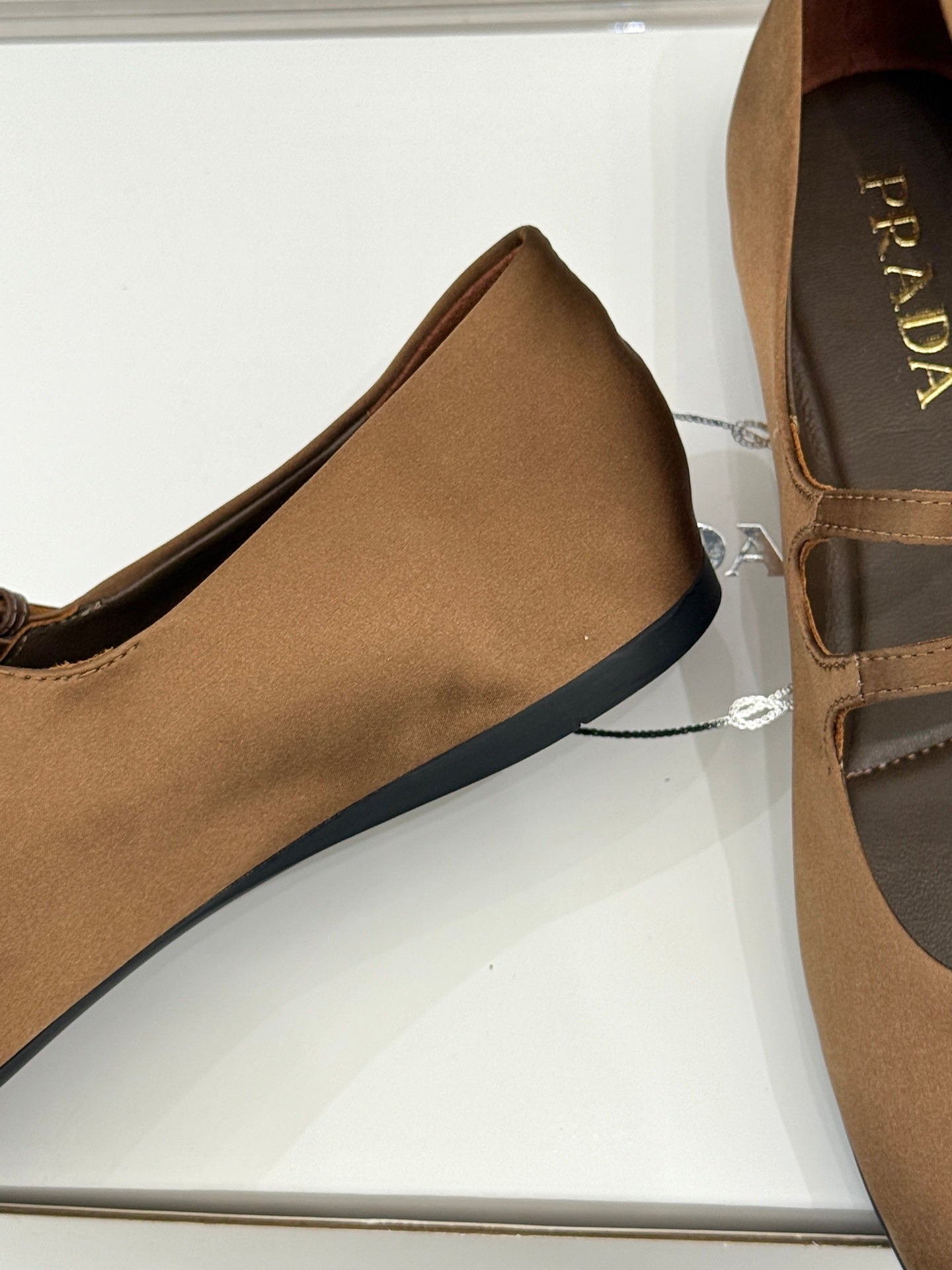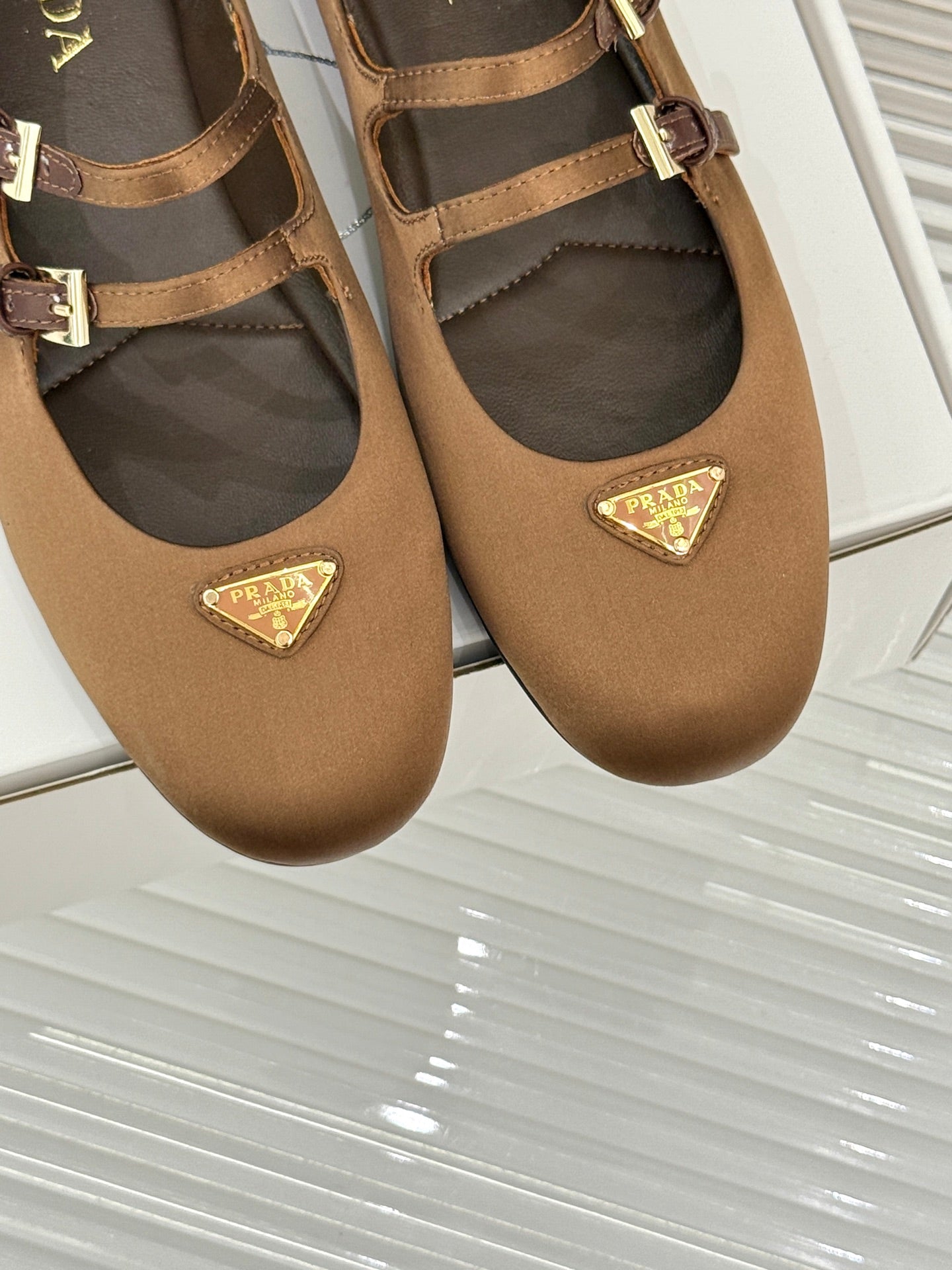 PRADA 25S DOUBLE STRAP BALLERINAS IN DARK BROWN SATIN