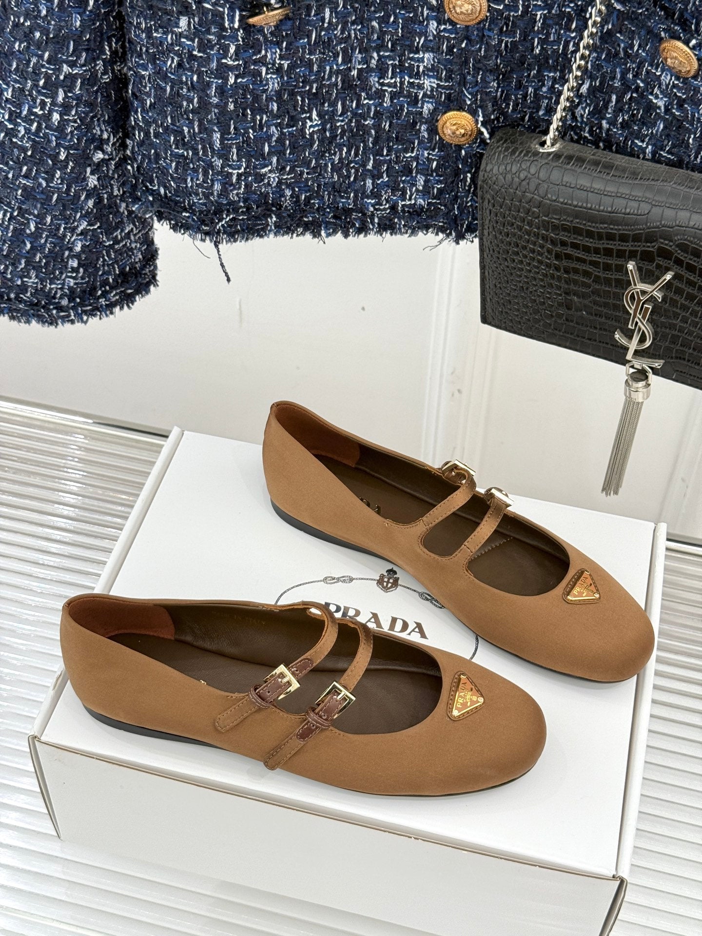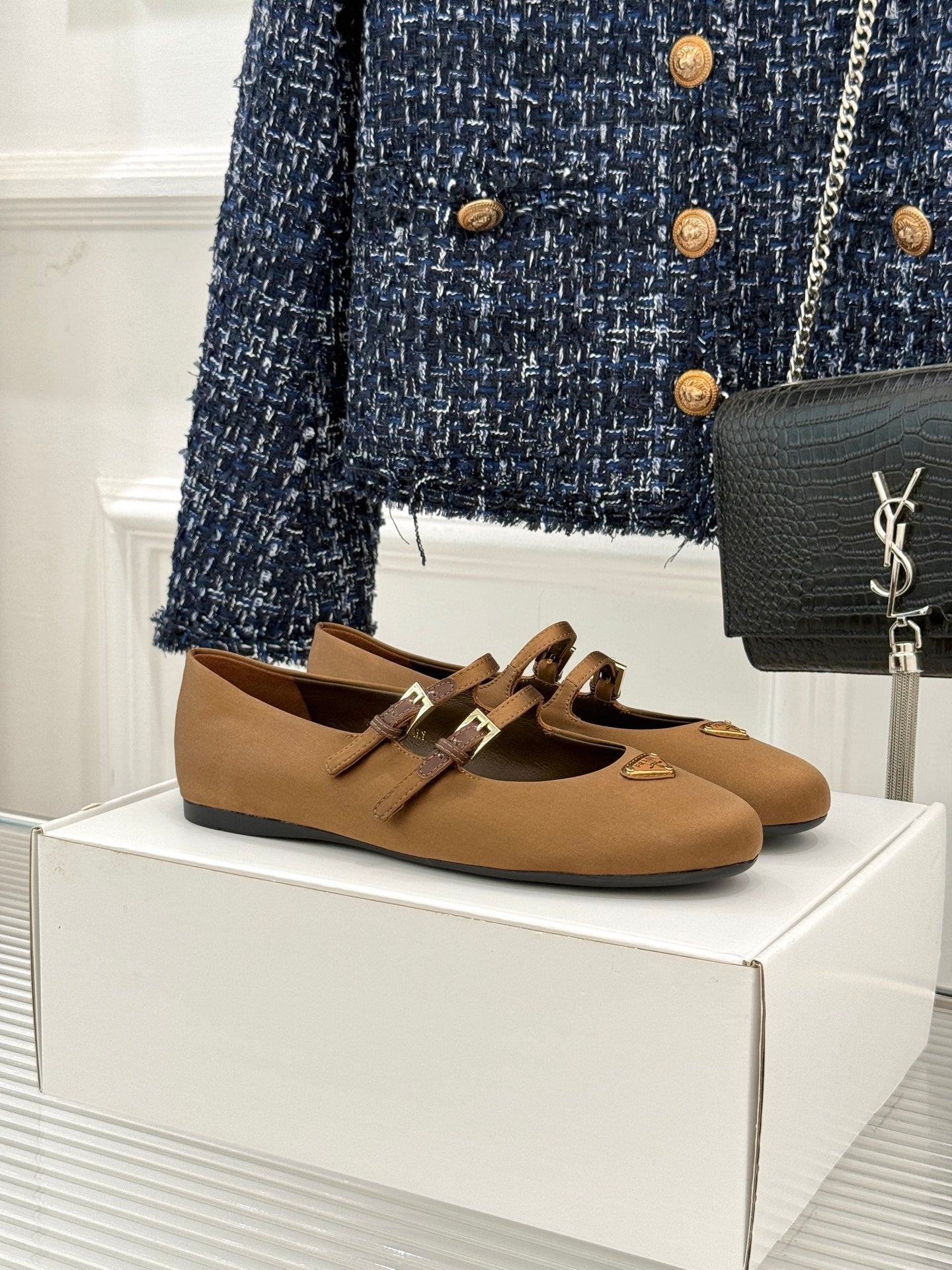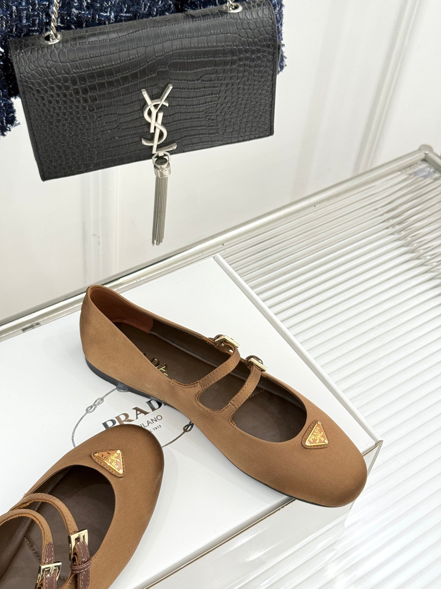PRADA 25S DOUBLE STRAP BALLERINAS IN DARK BROWN SATIN