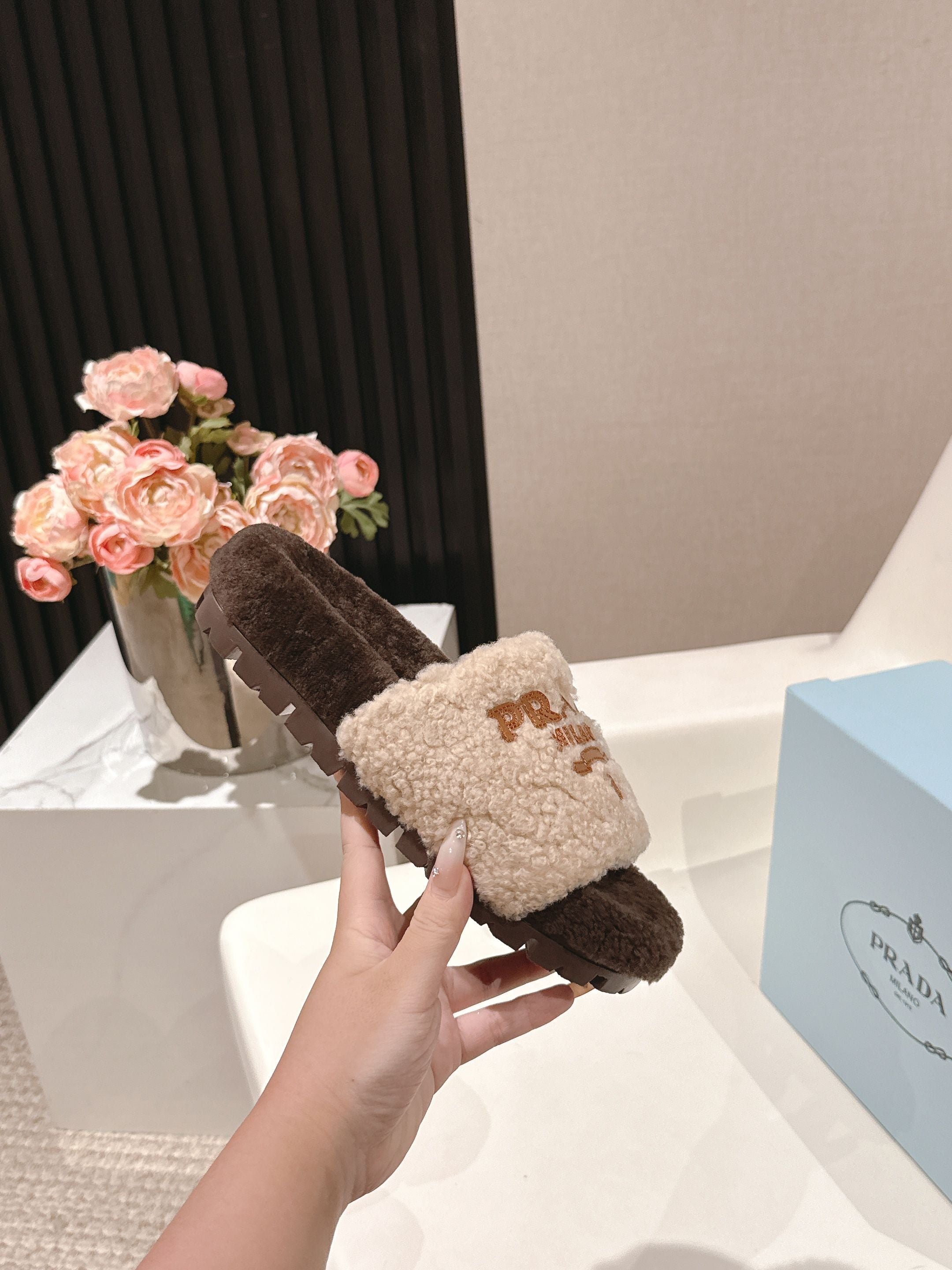 PRADA 25S FLAT MULES IN CREAM AND DARK BROWN RABBIT FUR