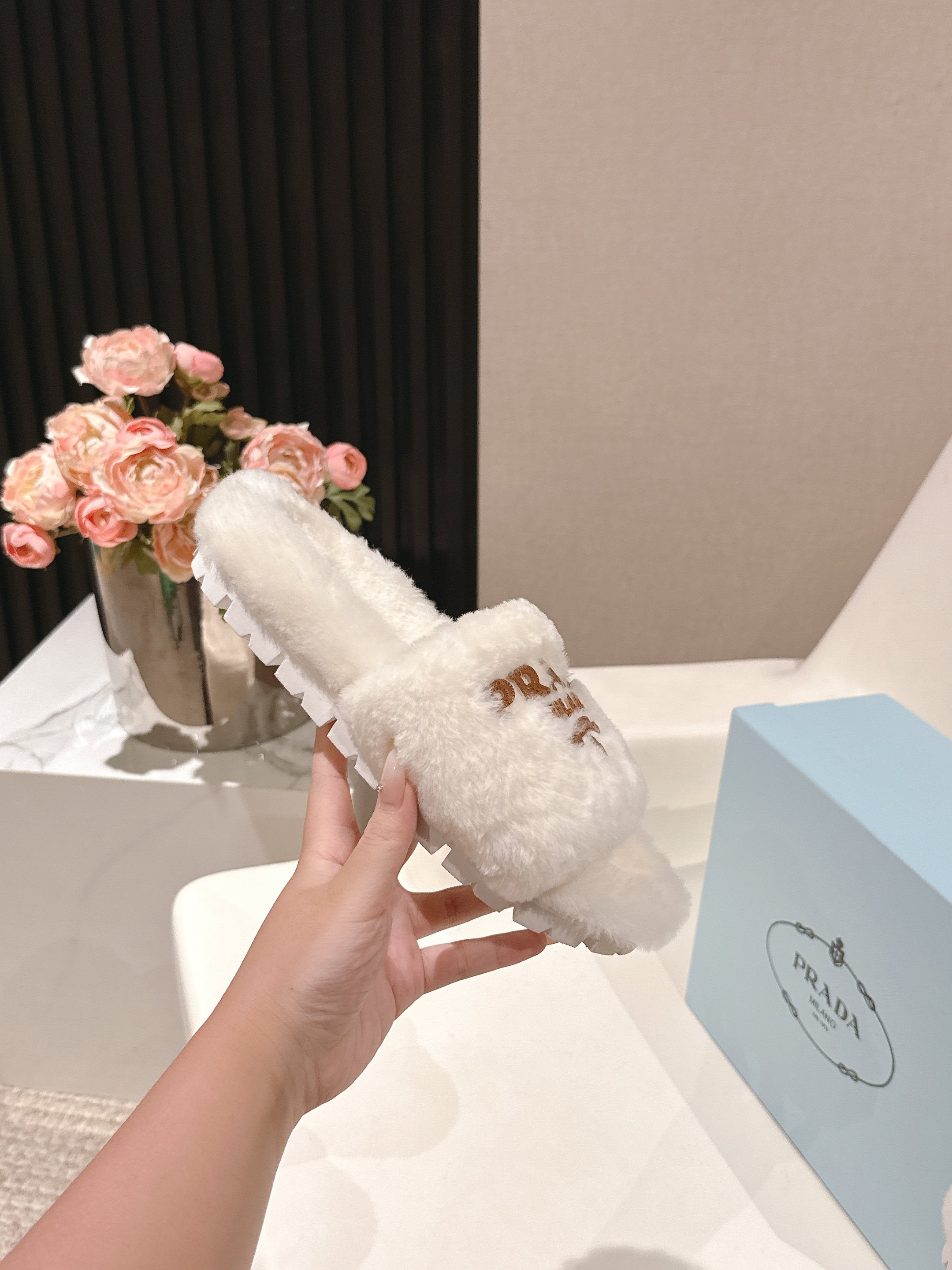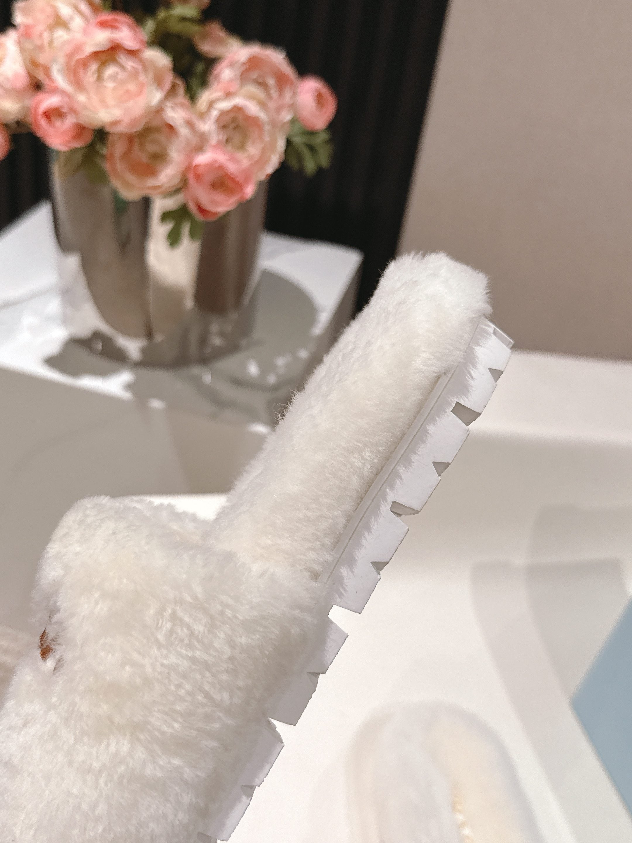 PRADA 25S FLAT MULES IN WHITE RABBIT FUR