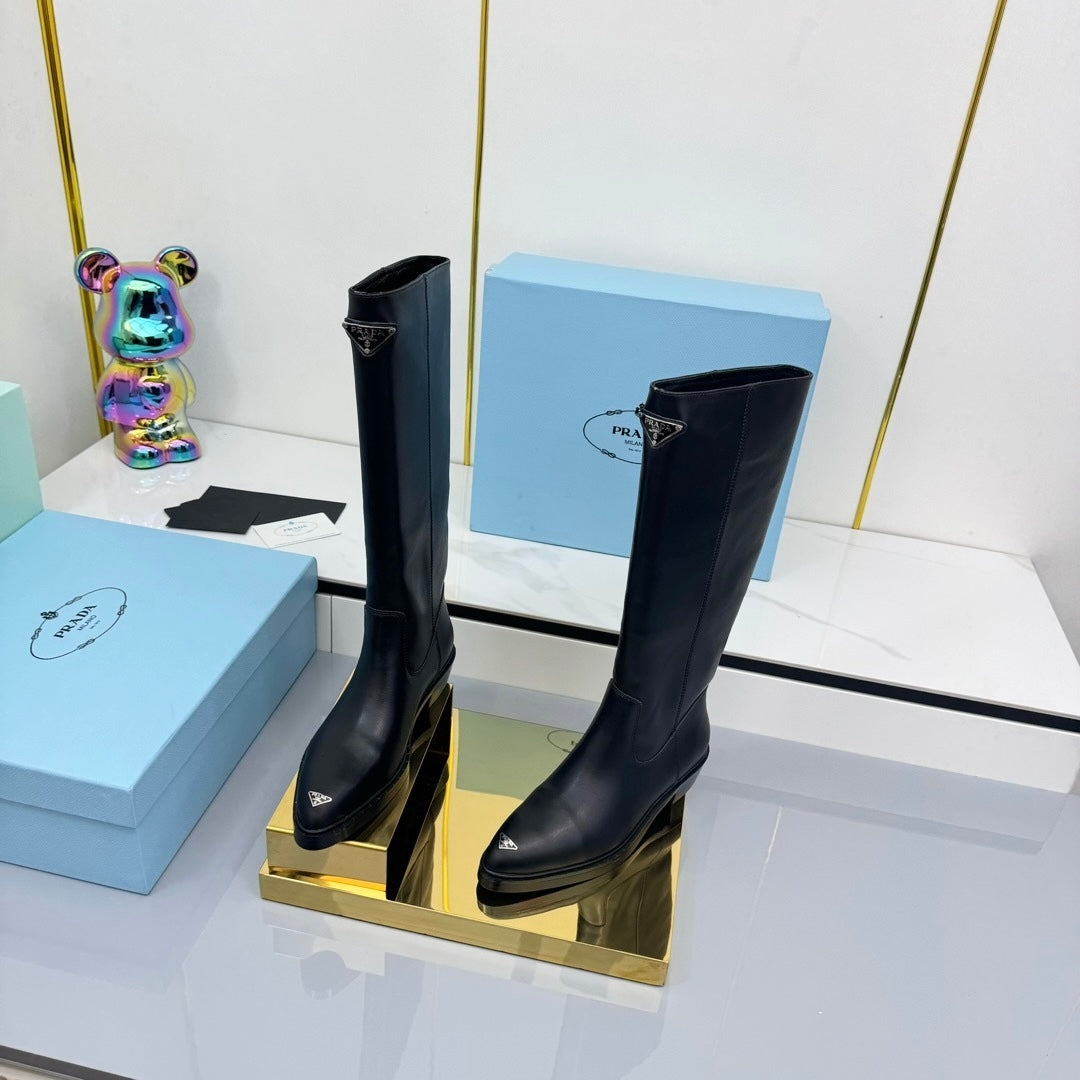 PRADA 25S POINTED TALL BOOTS 50MM IN BLACK CALFSKIN WITH LOGO