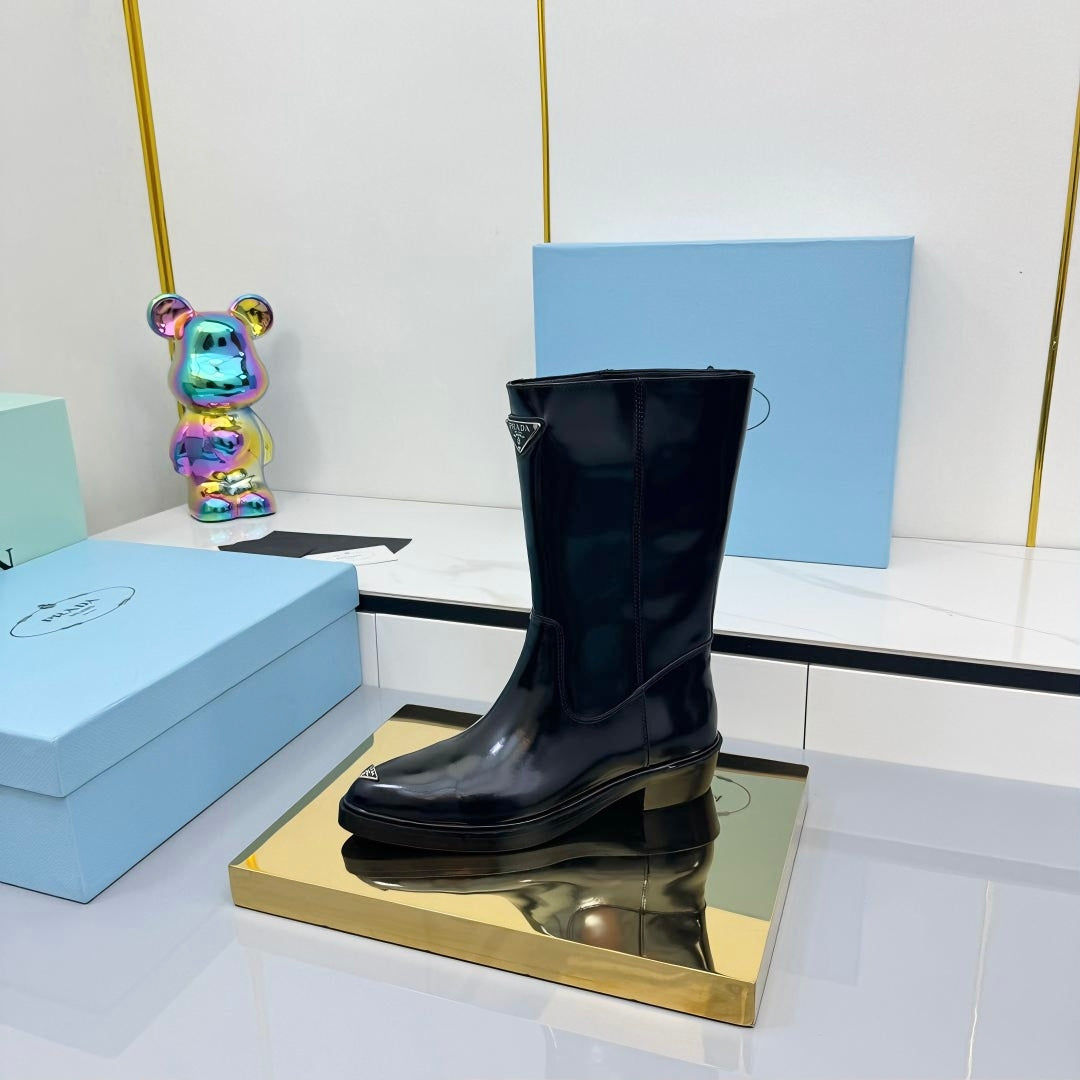 PRADA 25S POINTED TOE HIGH BOOTS 50MM IN BLACK GLOSSY CALFSKIN WITH LOGO