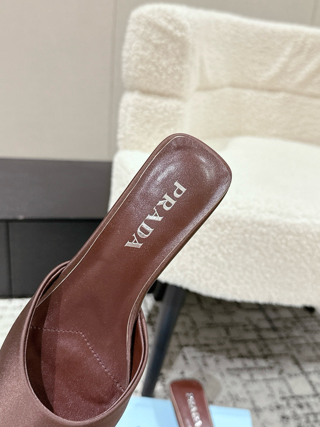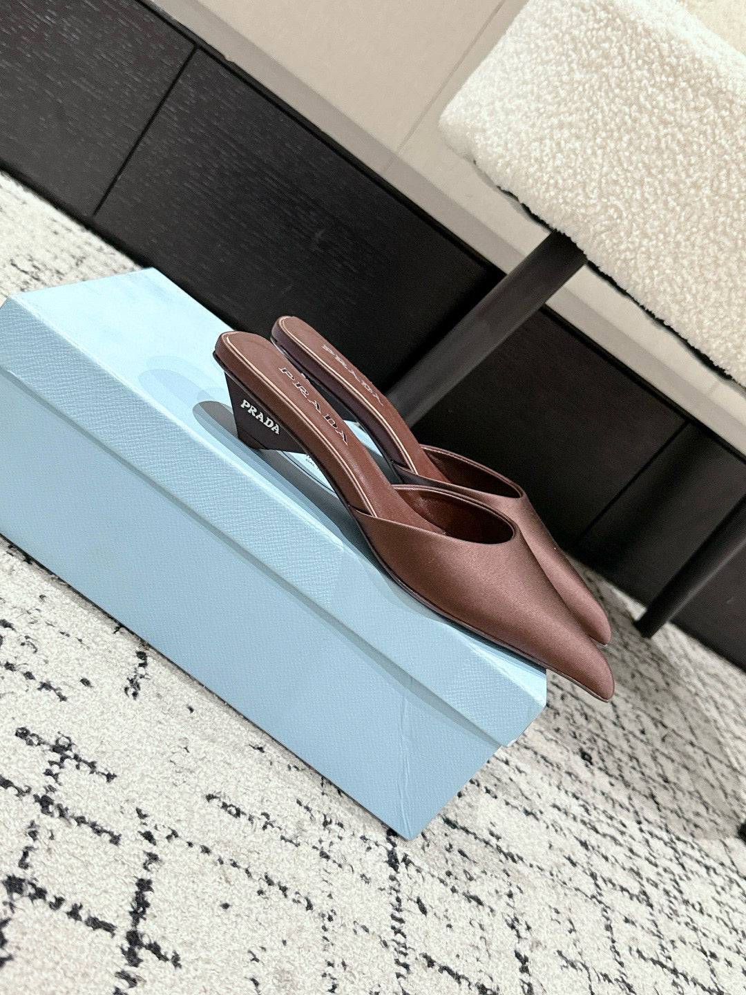 PRADA 25S POINTED-TOE MULES IN DARK BROWN SATIN