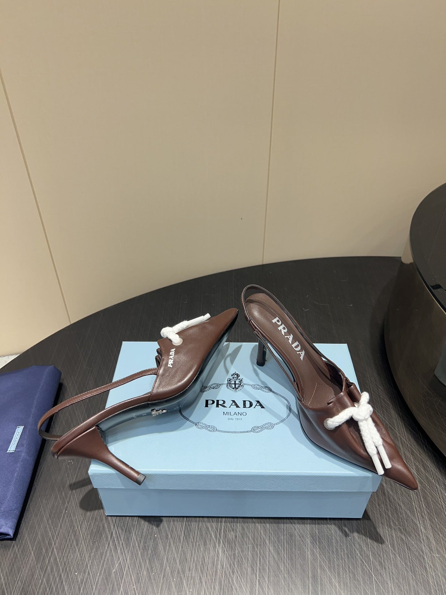 PRADA 25S POINTED TOE SLINGBACK 85MM IN DARK BROWN LAMBSKIN WITH TIE UP DESIGN