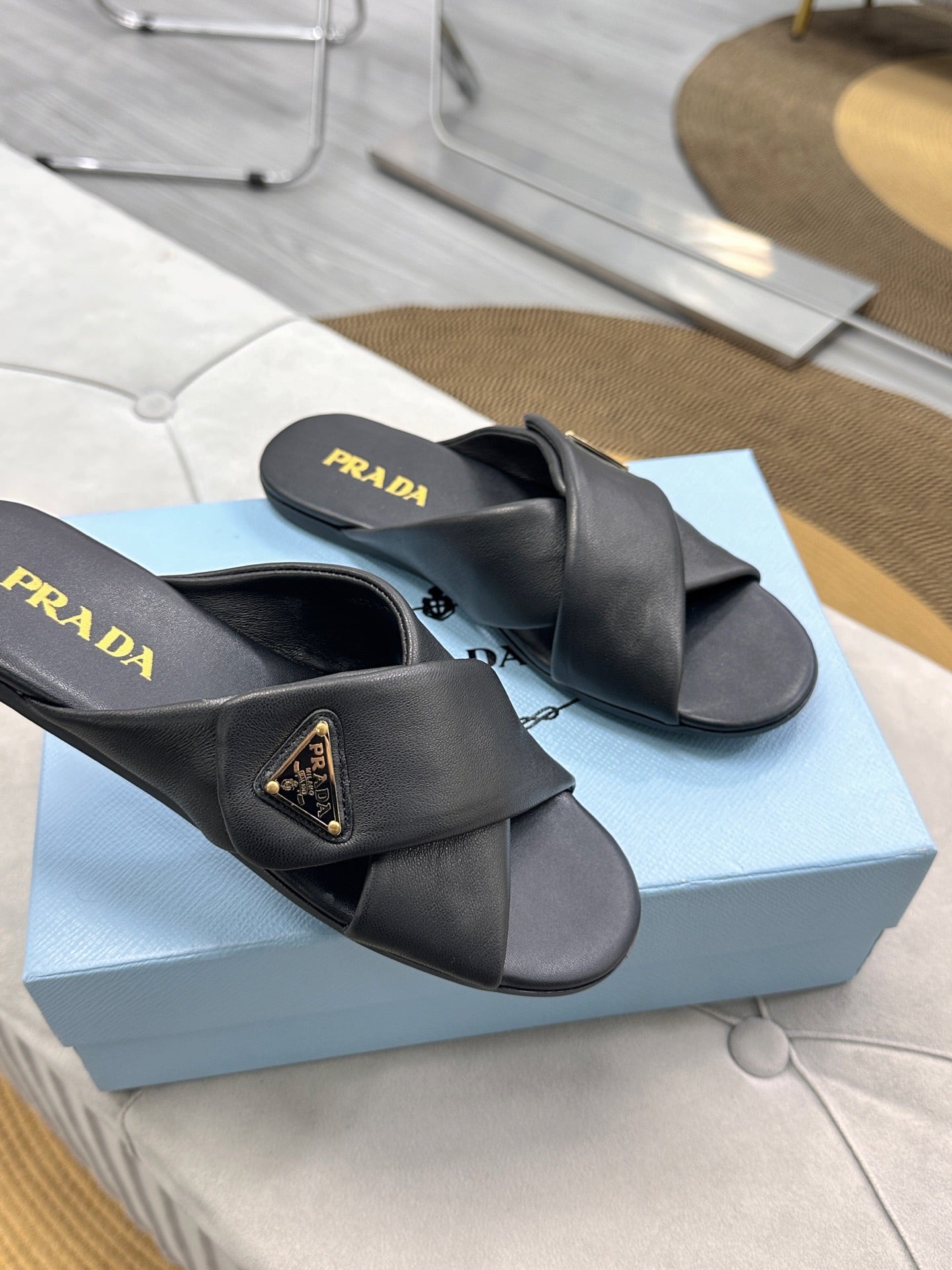 PRADA 25S SLIDE SANDALS IN BLACK CALFSKIN LOGO