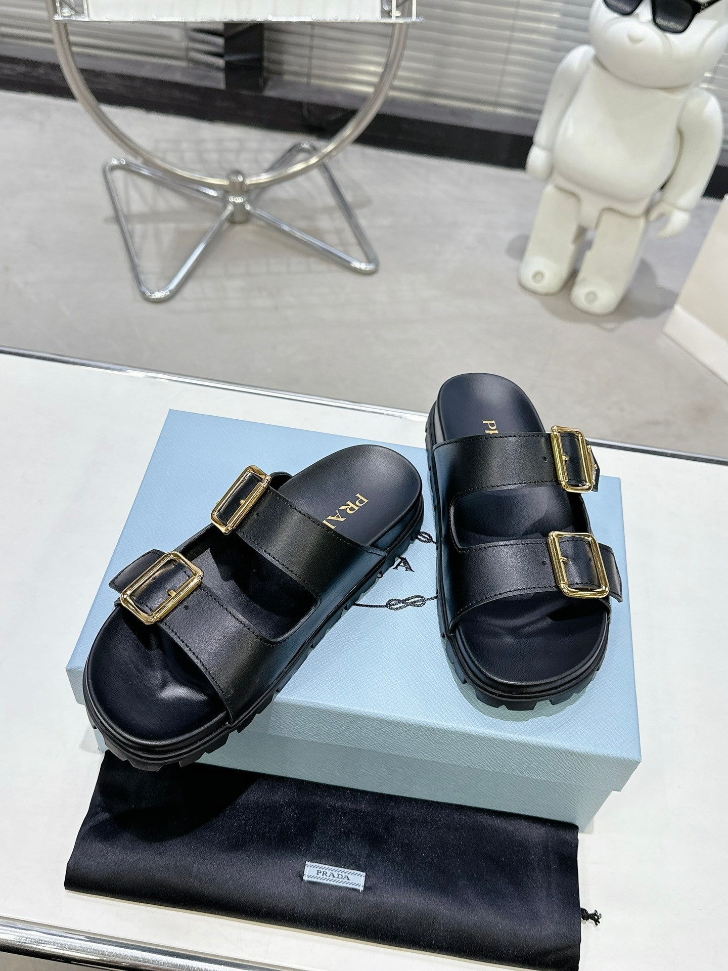 PRADA 25S STRAP SLIDES 30MM IN BLACK CALFSKIN GOLD HARDWARE