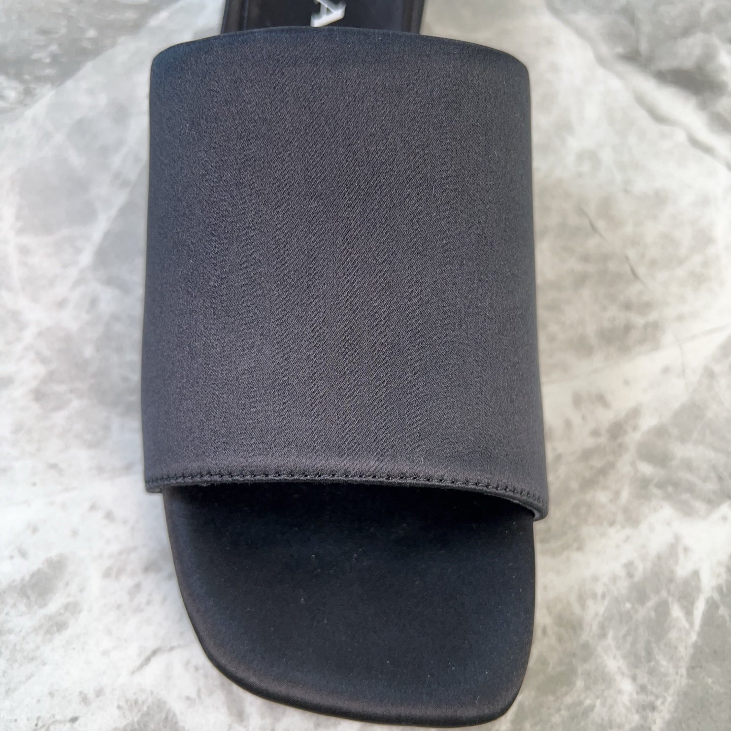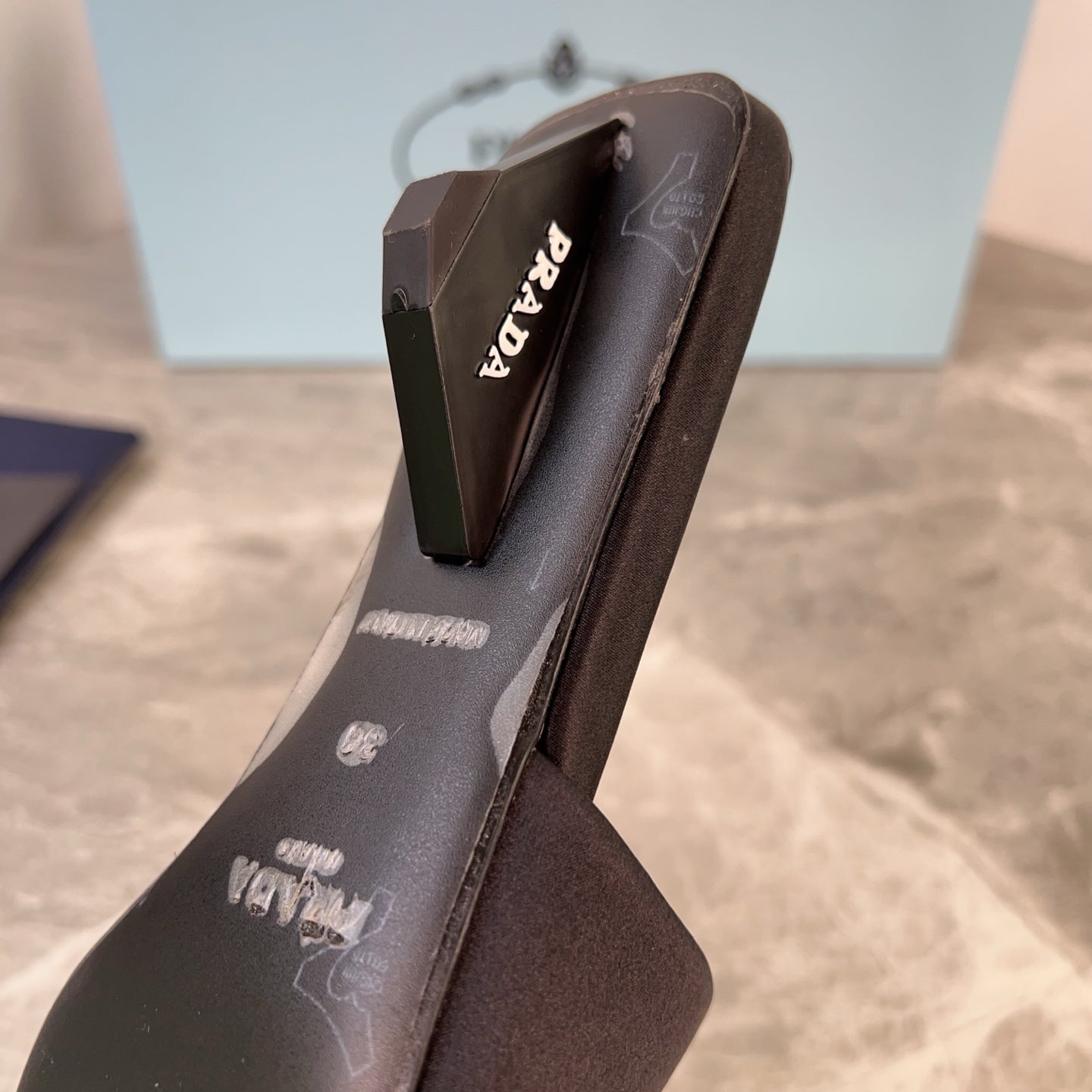 PRADA 25S TRIANGLE HEEL SANDALS 35MM IN BLACK SATIN