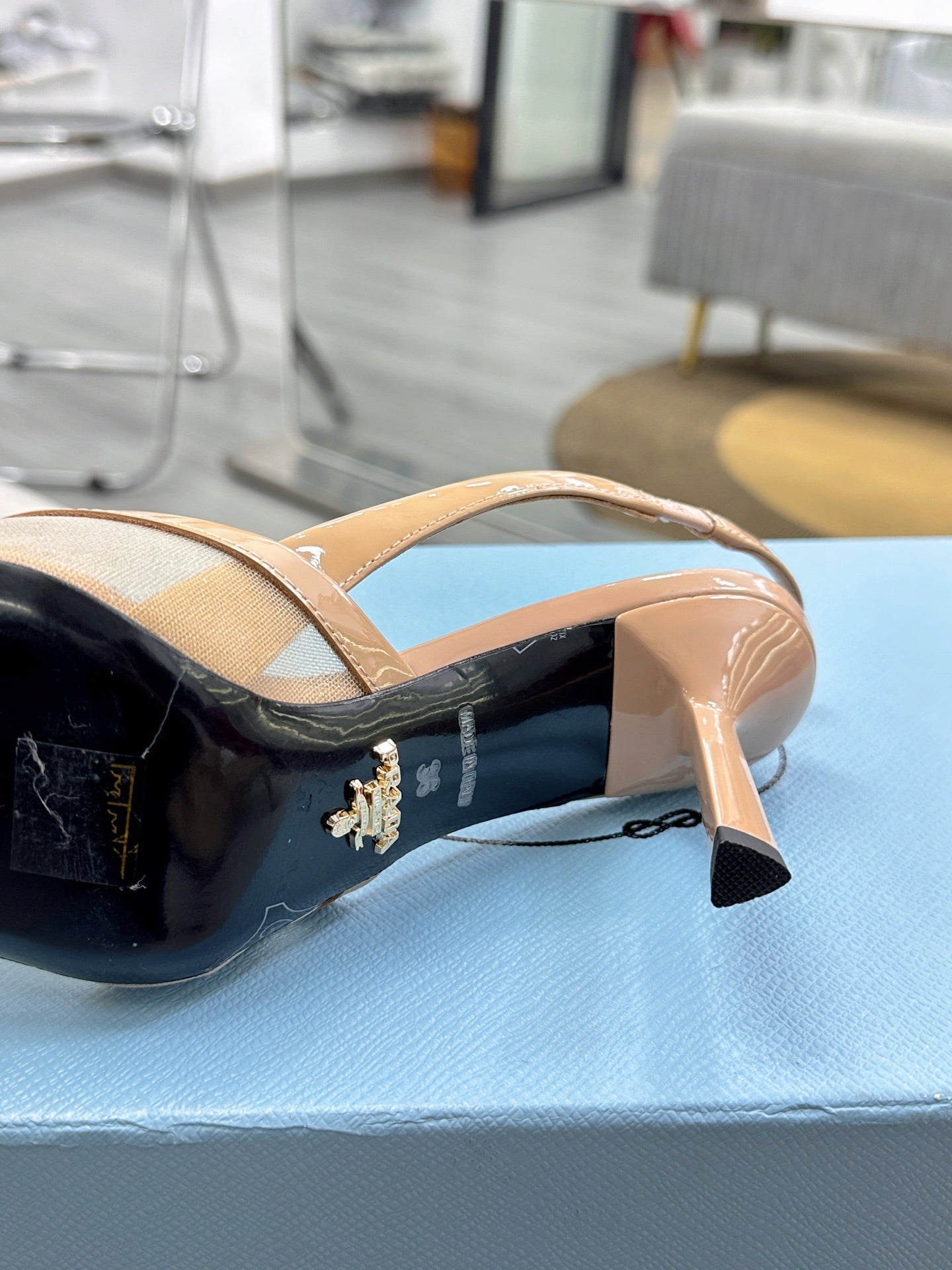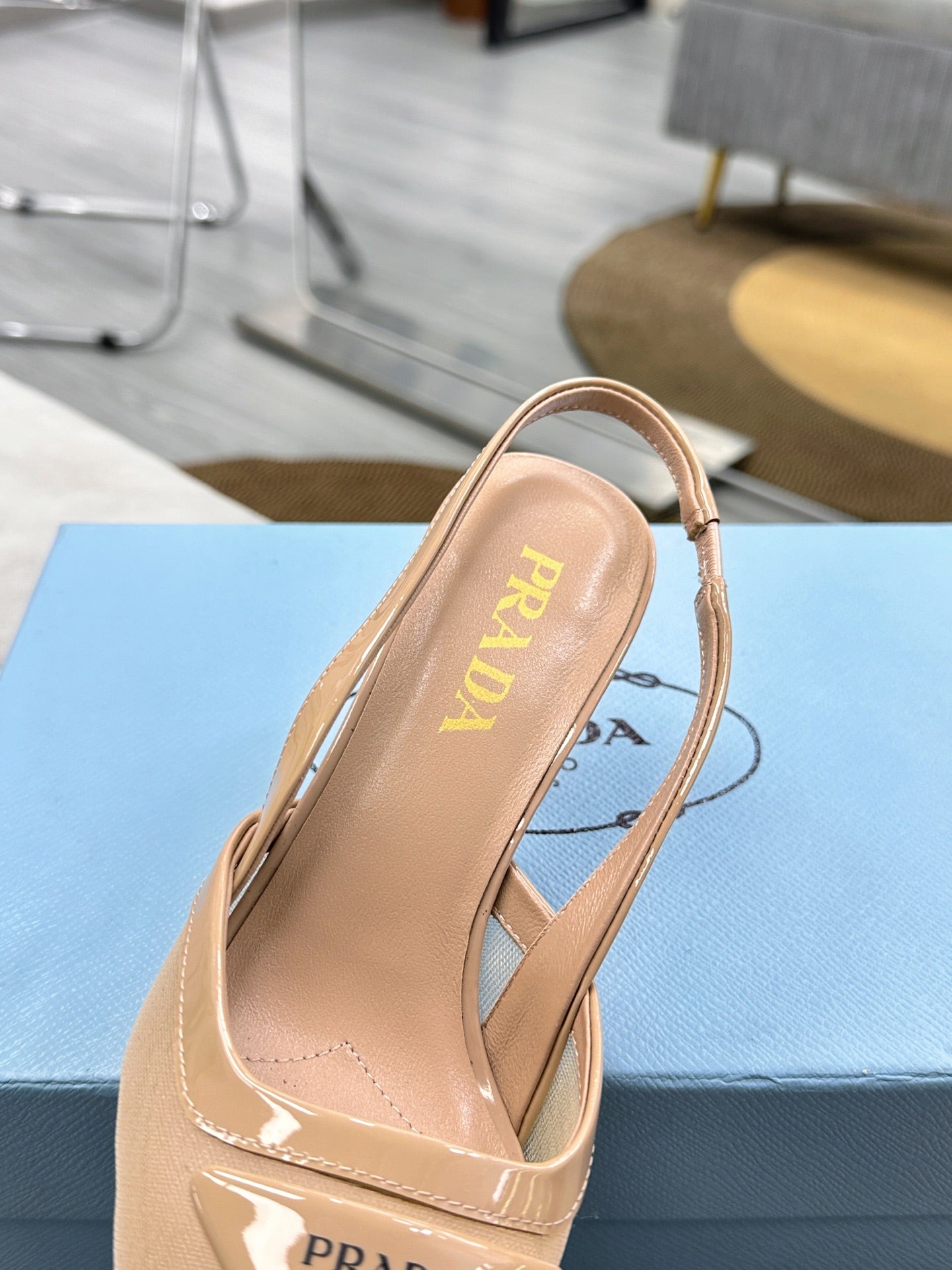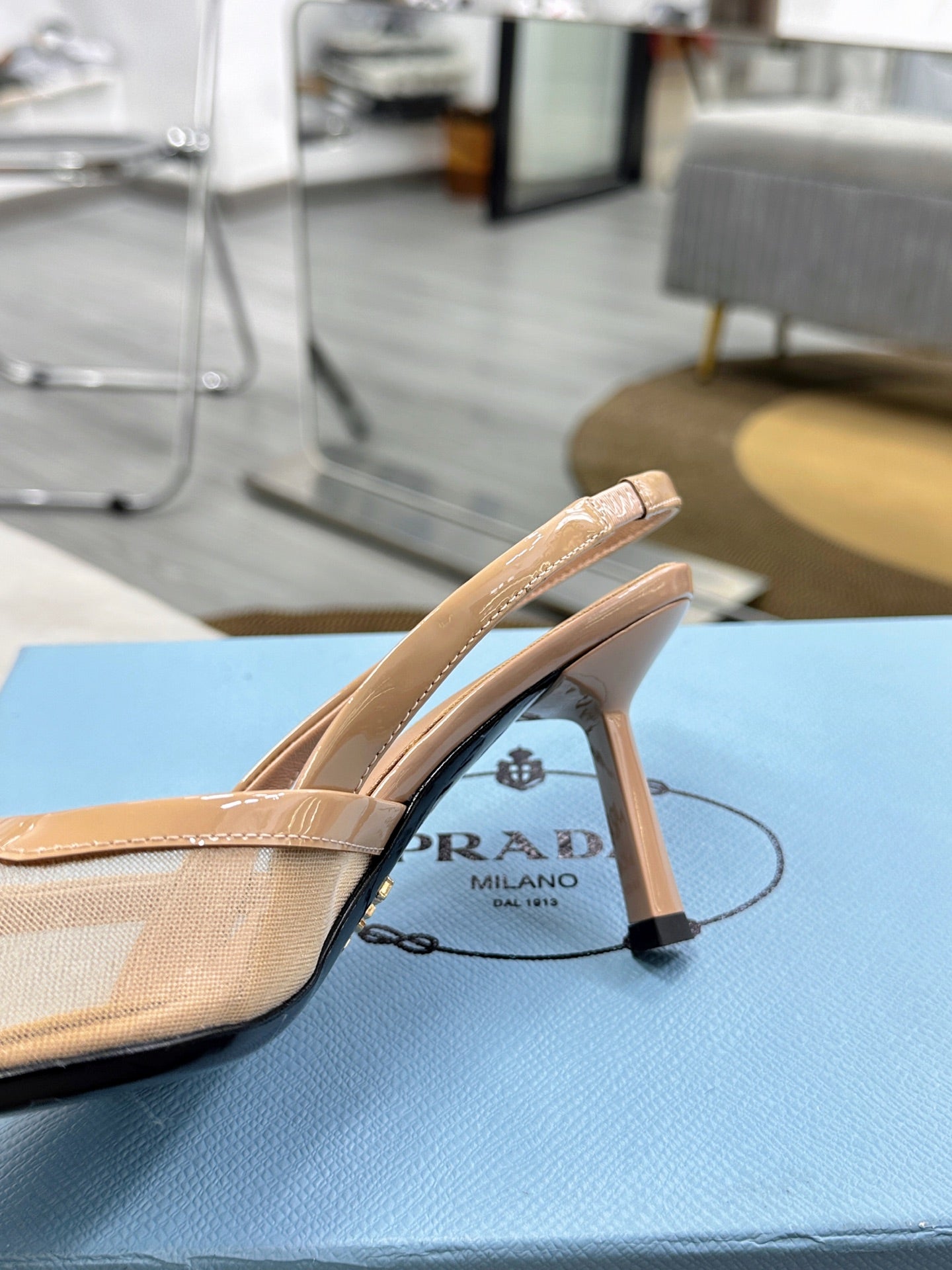 PRADA 25S TRIANGLE LOGO SLINGBACK PUMPS IN BEIGE MESH FABRIC