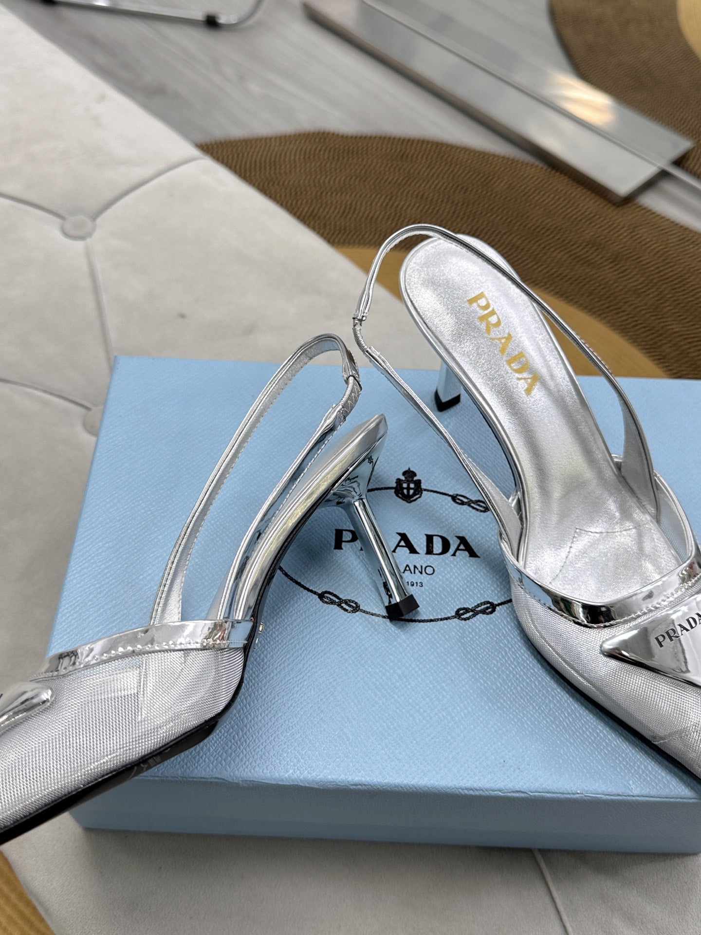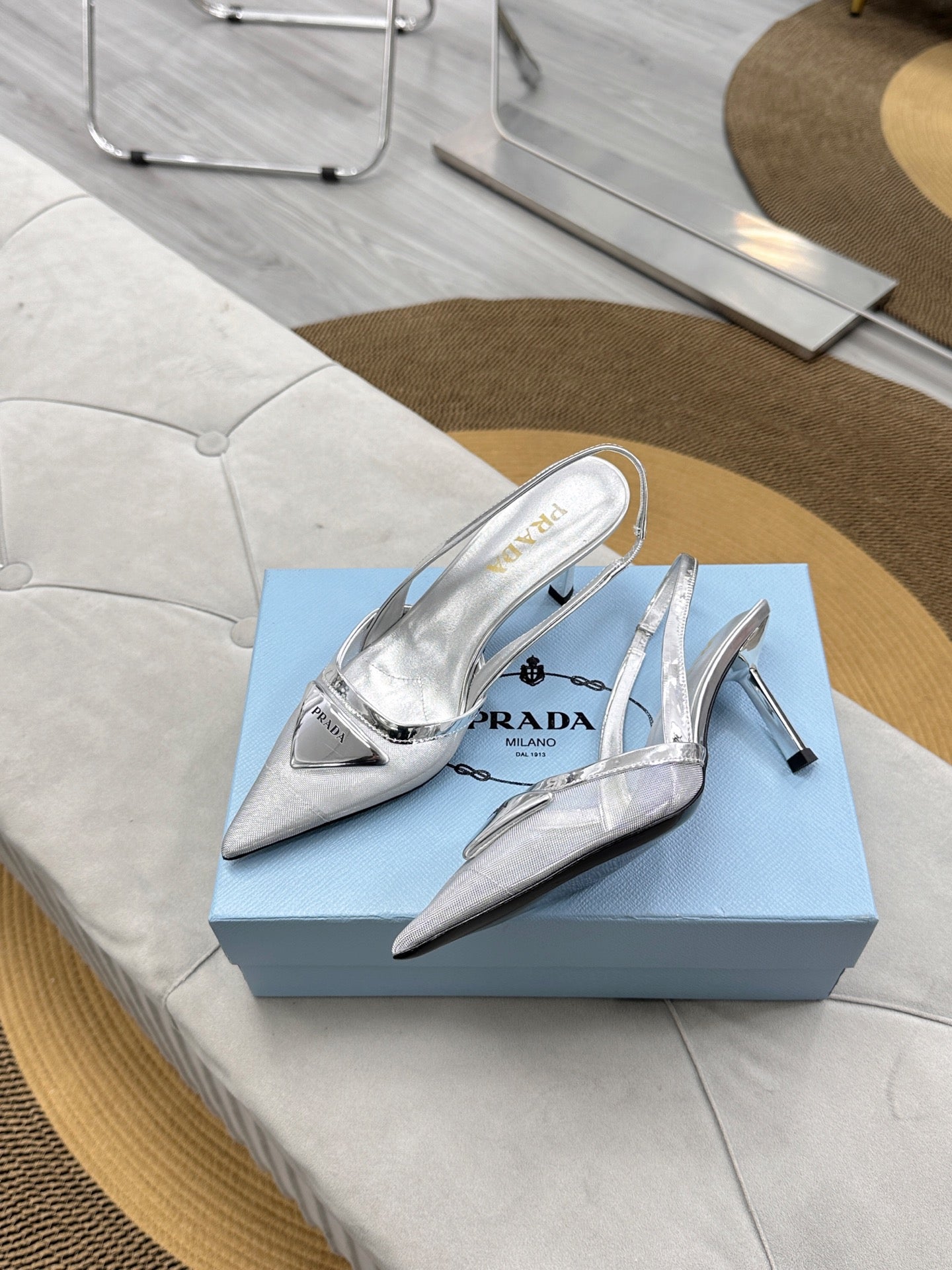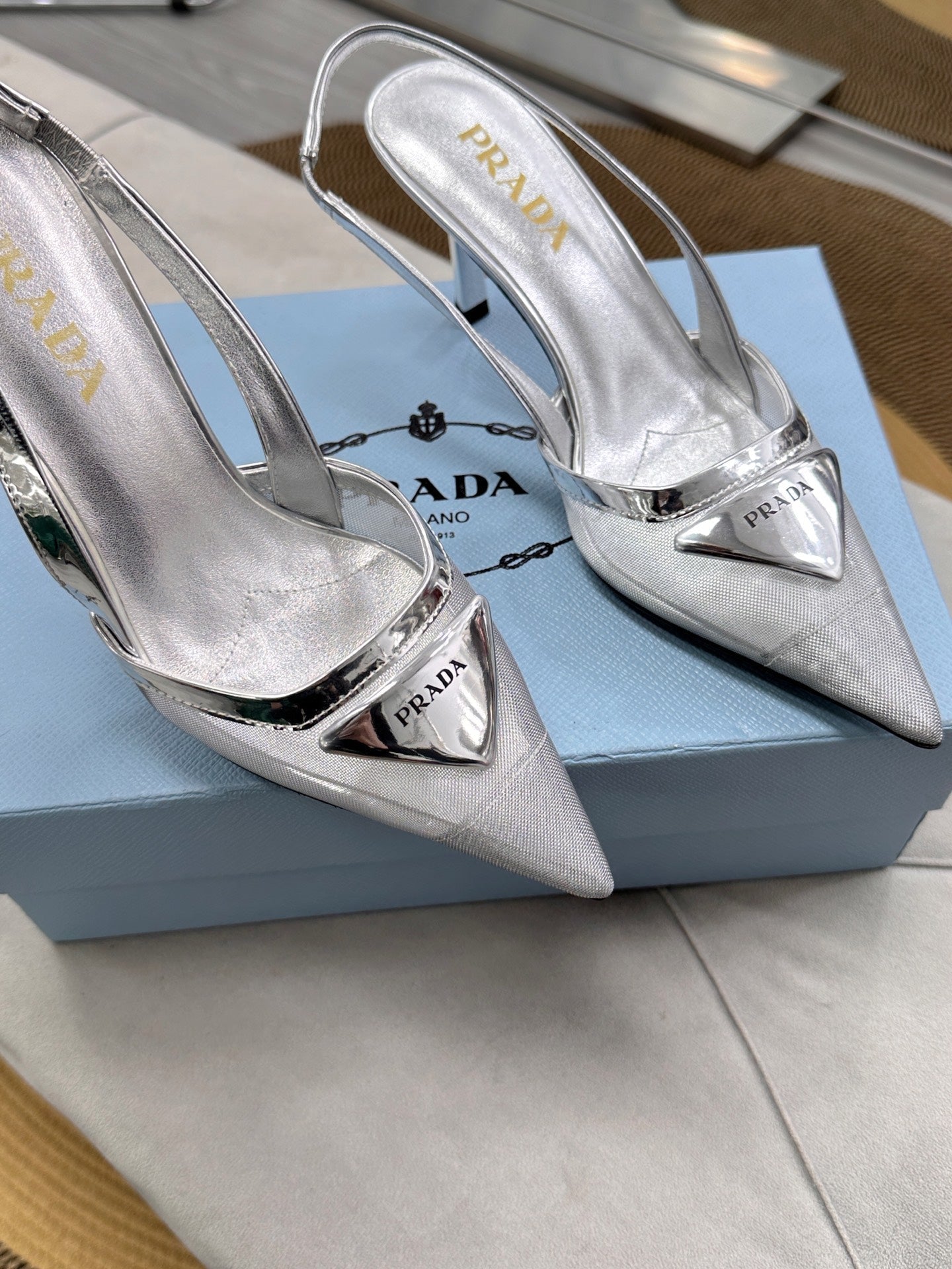 PRADA 25S TRIANGLE LOGO SLINGBACK PUMPS IN SILVER MESH FABRIC