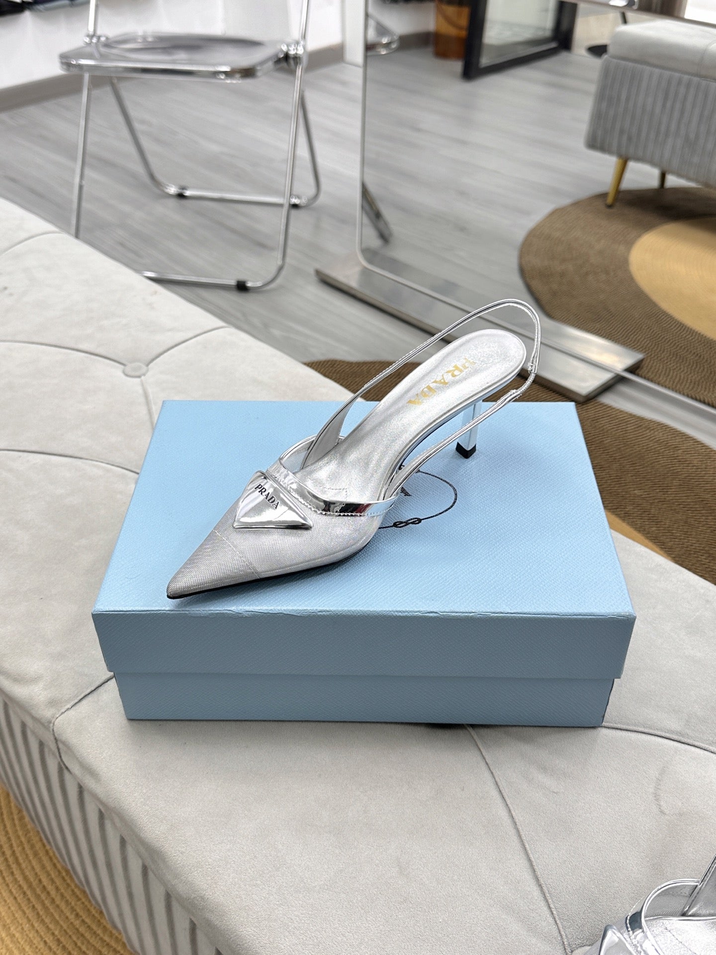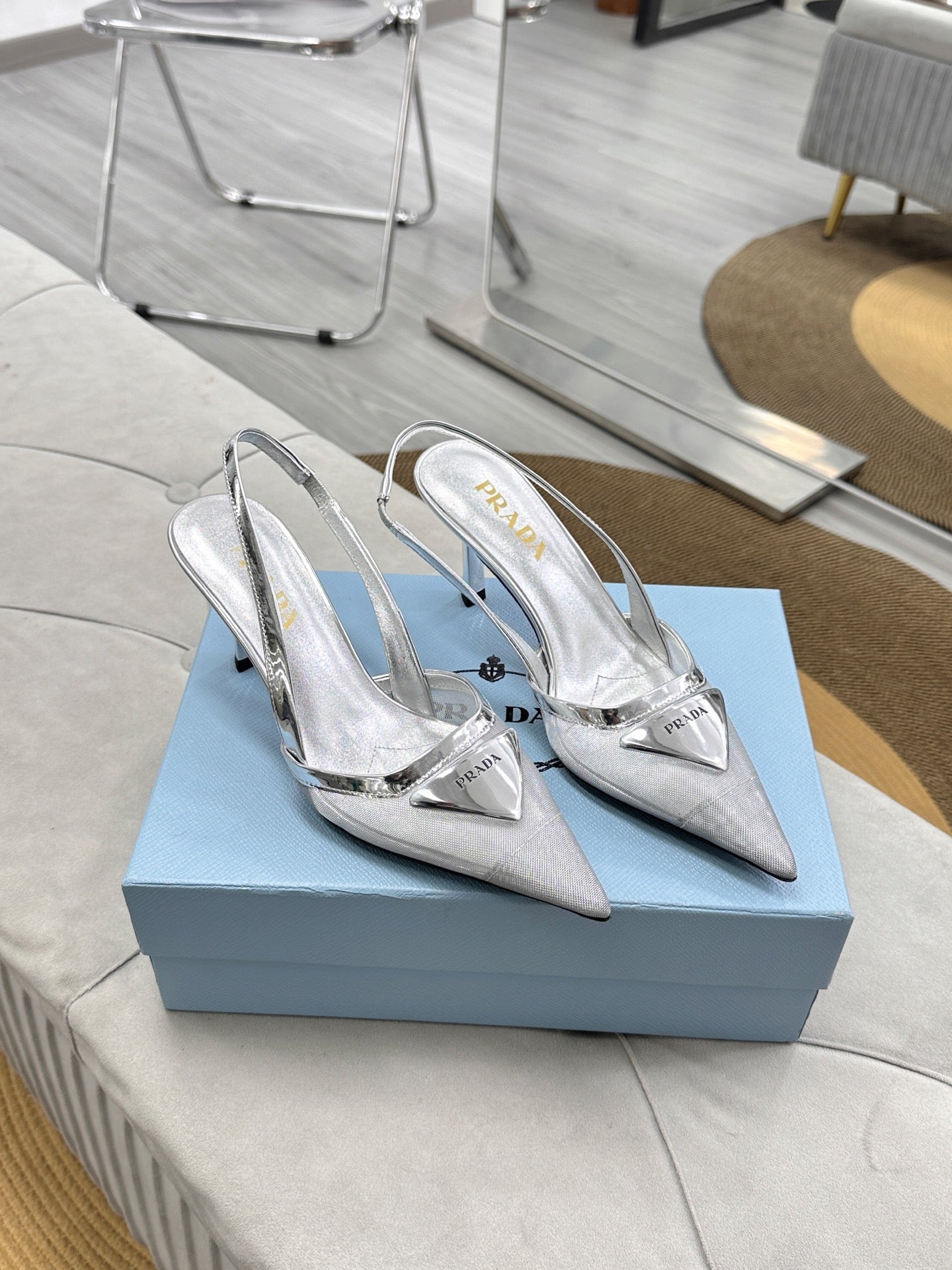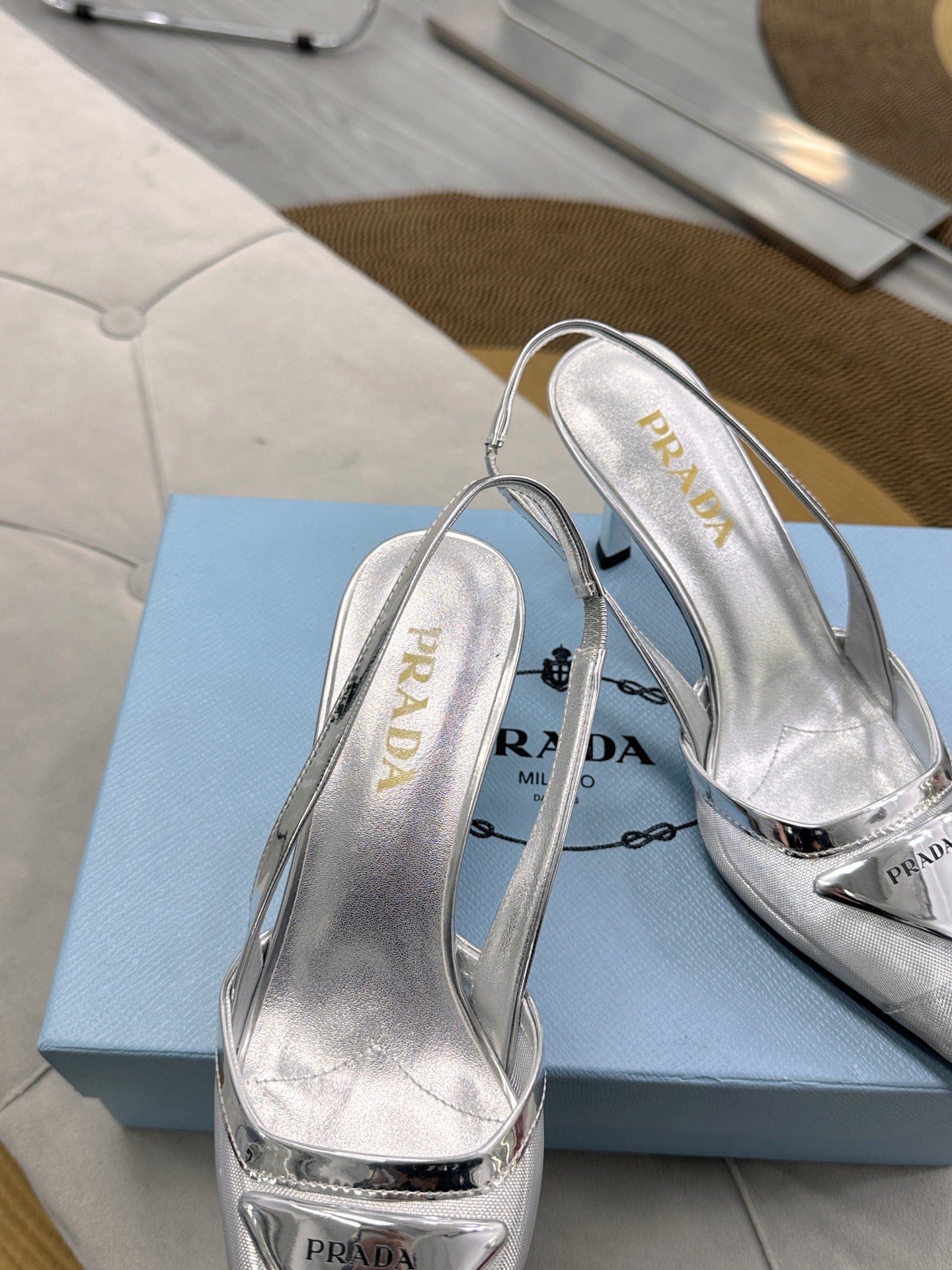 PRADA 25S TRIANGLE LOGO SLINGBACK PUMPS IN SILVER MESH FABRIC