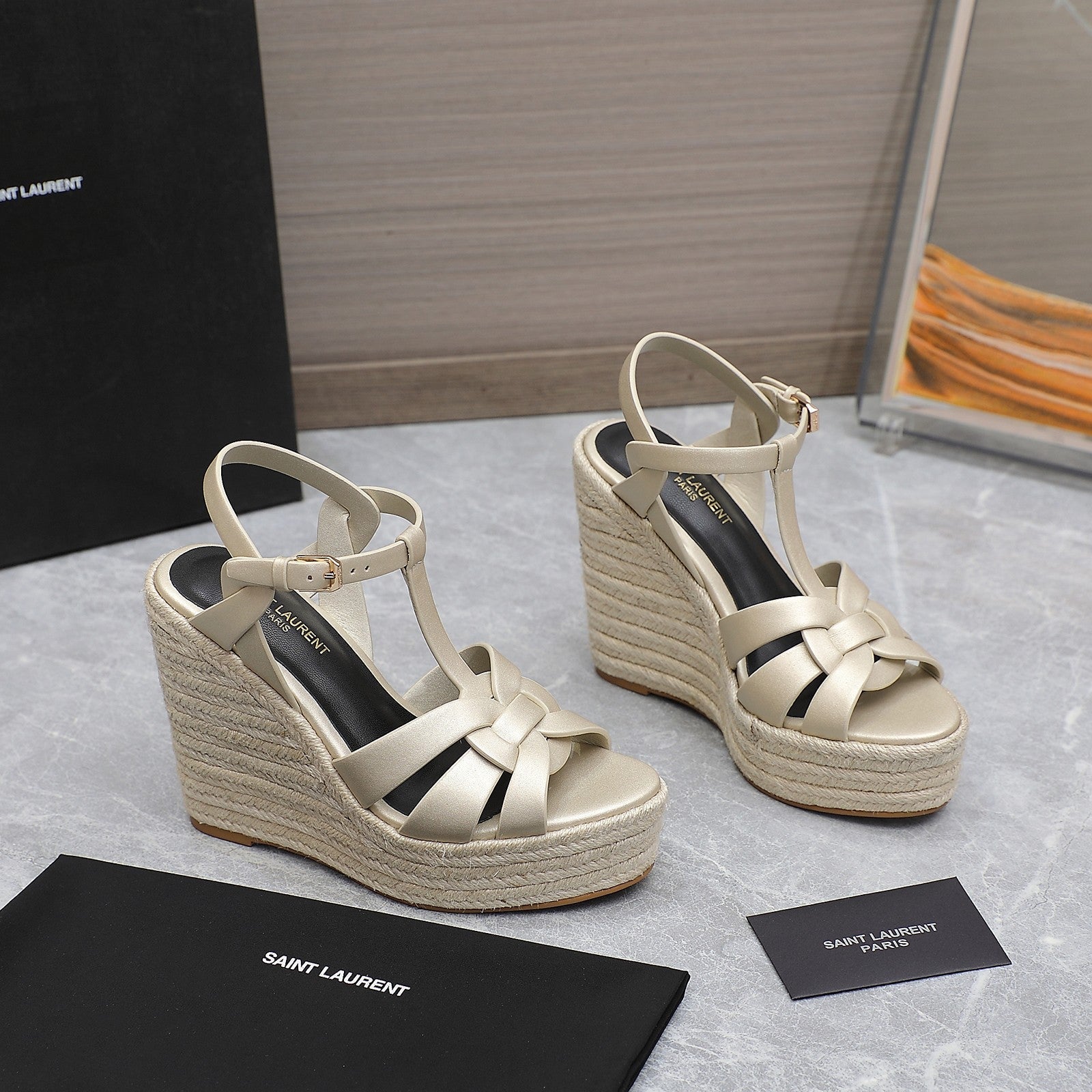 SL TRIBUTE WEDGE SANDALS METALLIC BEIGE CALFSKIN