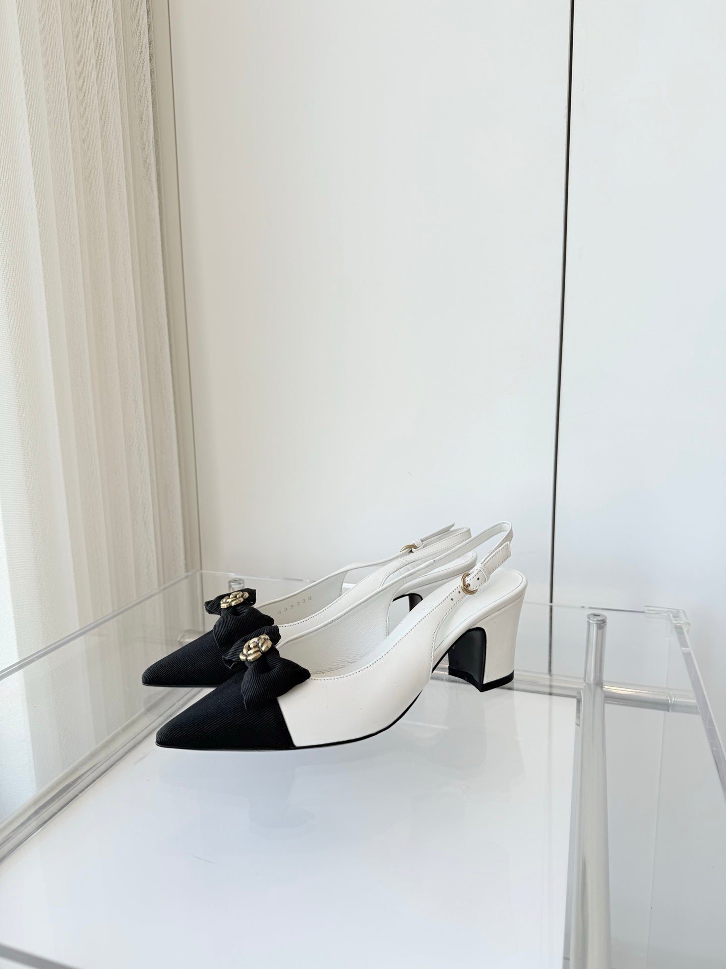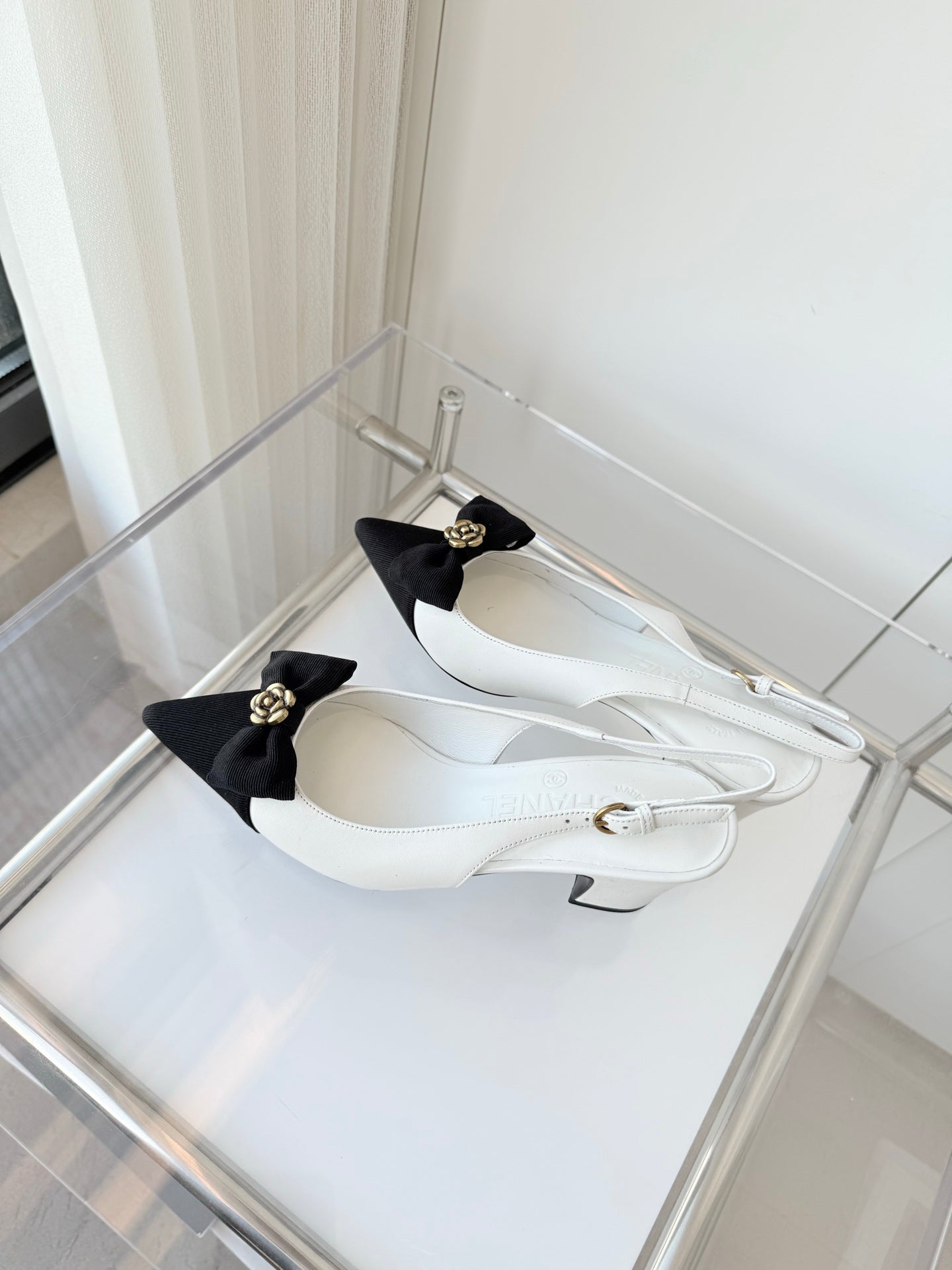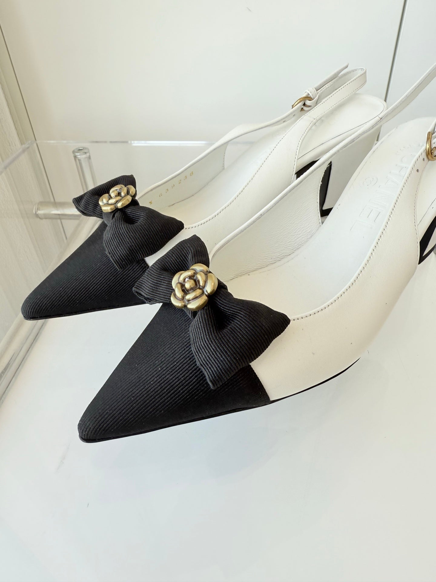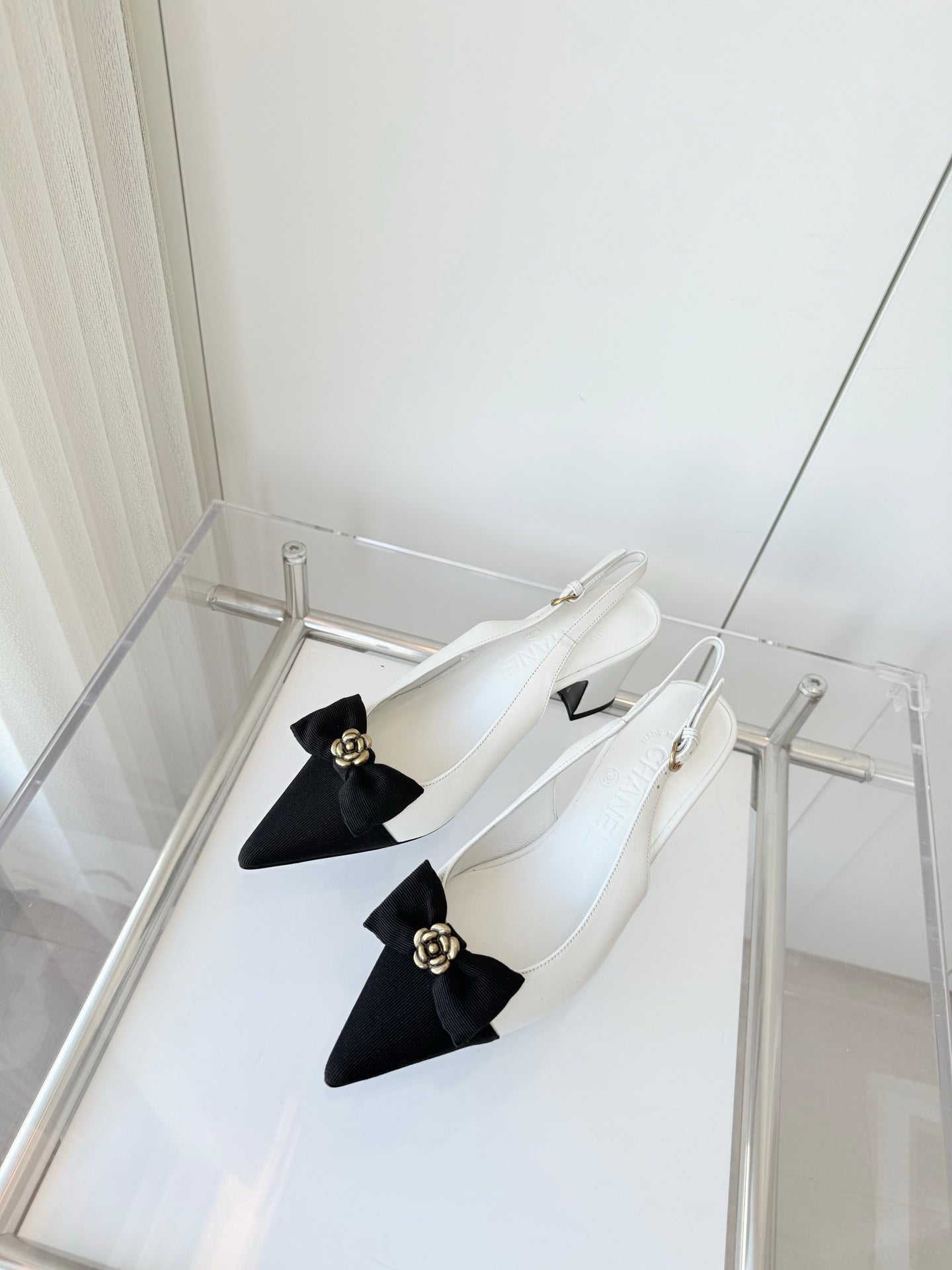 SLINGBACKS 65 MM IN WHITE CALFSKIN AND BLACK CANVAS