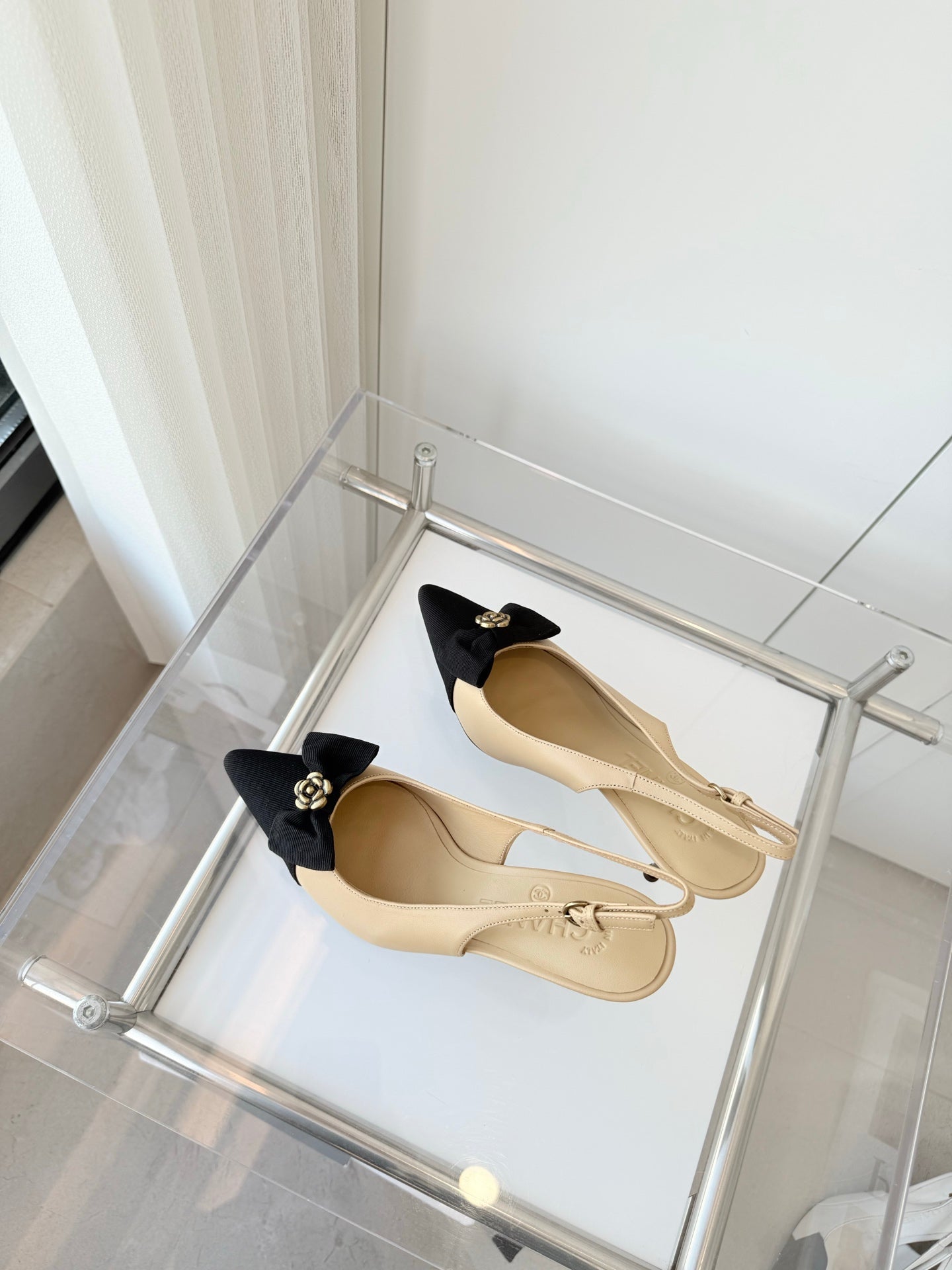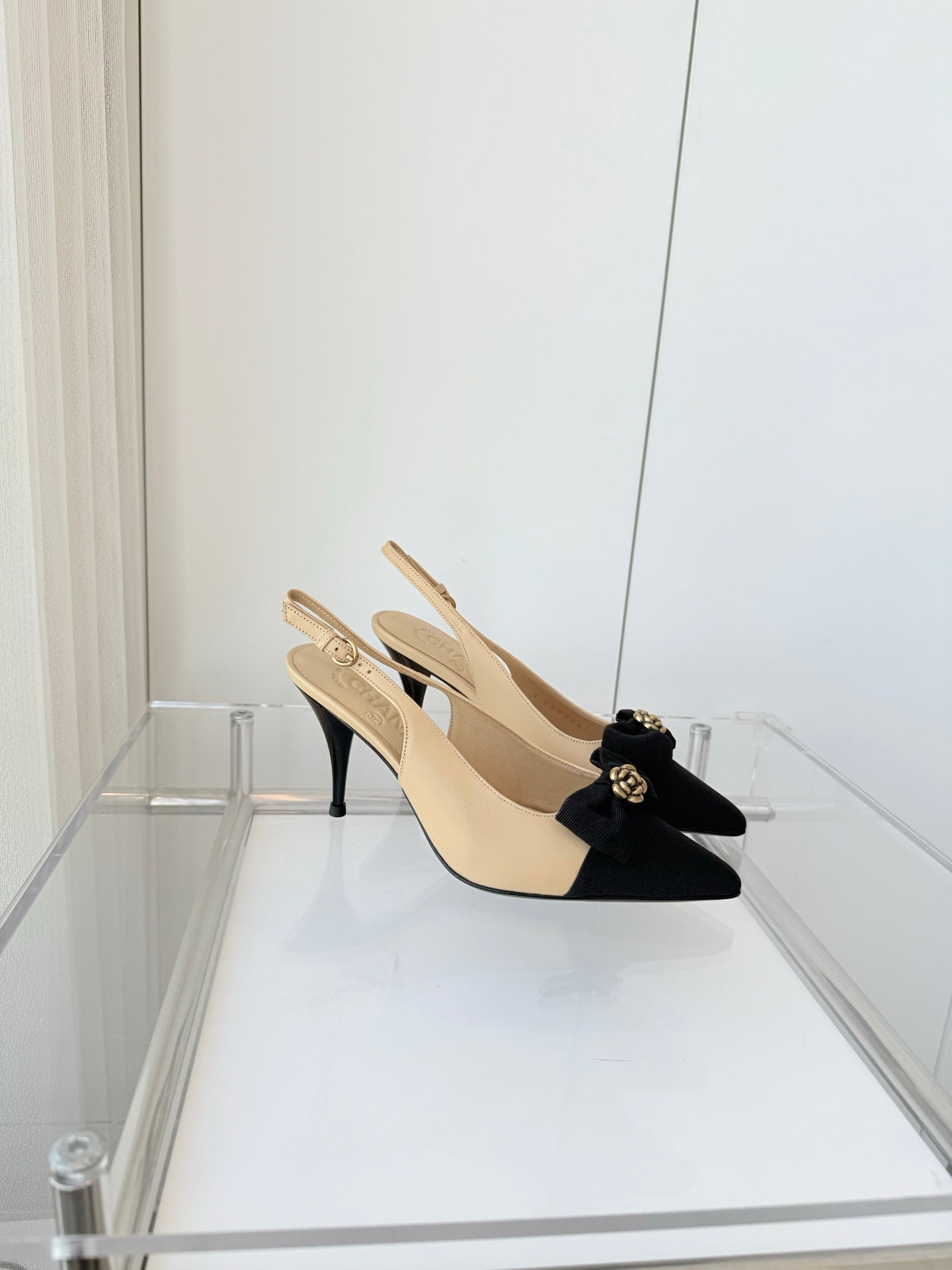 SLINGBACKS 80 MM IN BEIGE CALFSKIN AND BLACK CANVAS