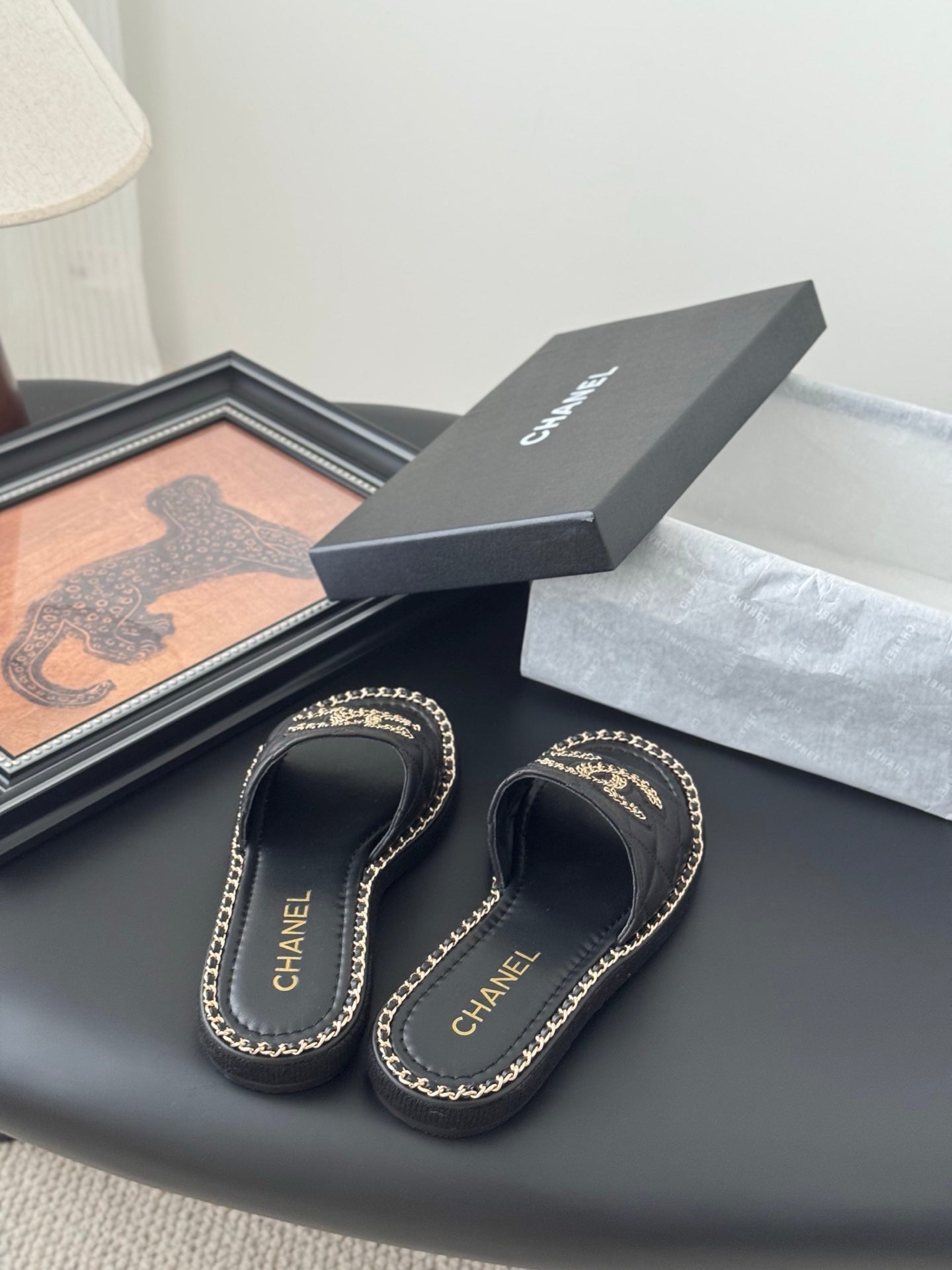SLIPPER IN BLACK CALFSKIN MIX CHAIN BASE