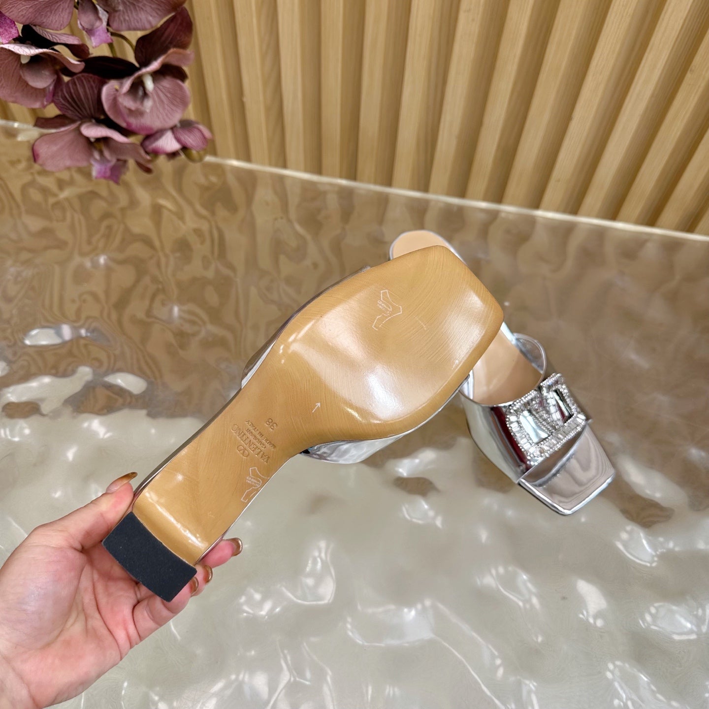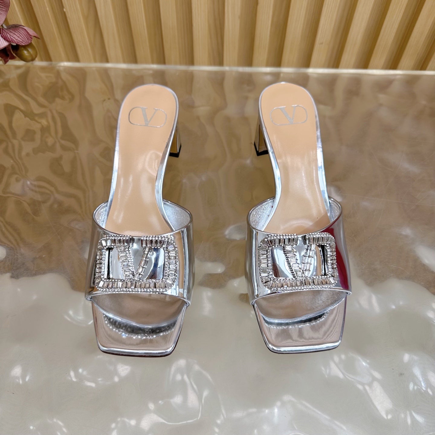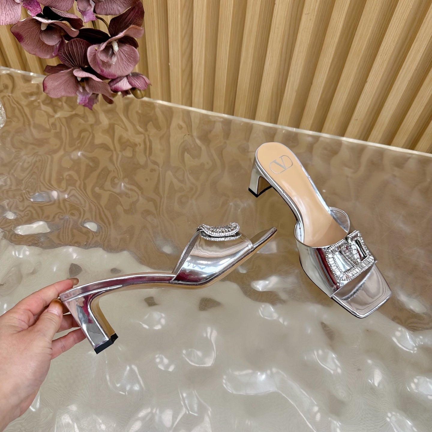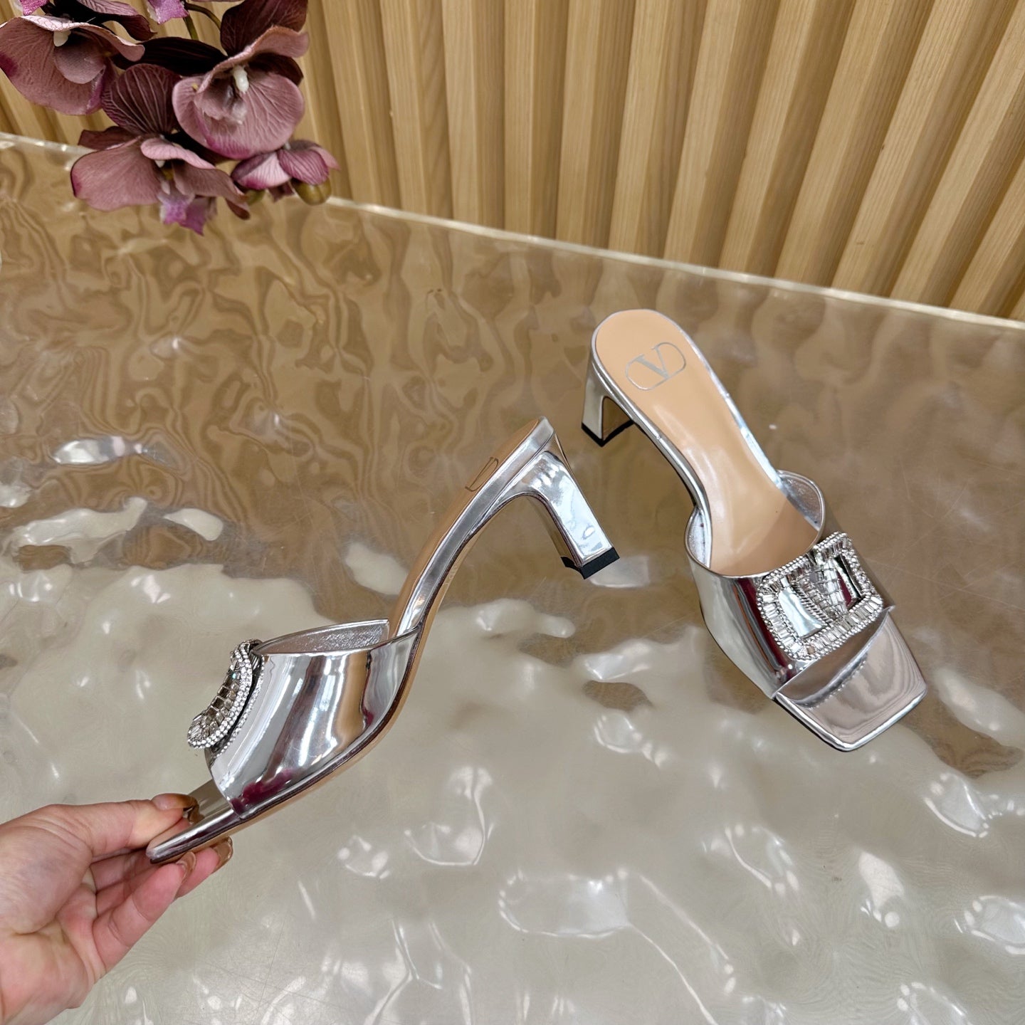 VALENTINO 25S HIGH-HEEL MULES 60 MM IN SILVER PATENT CALFSKIN WITH CRYSTAL-EMBELLISHED STRAP