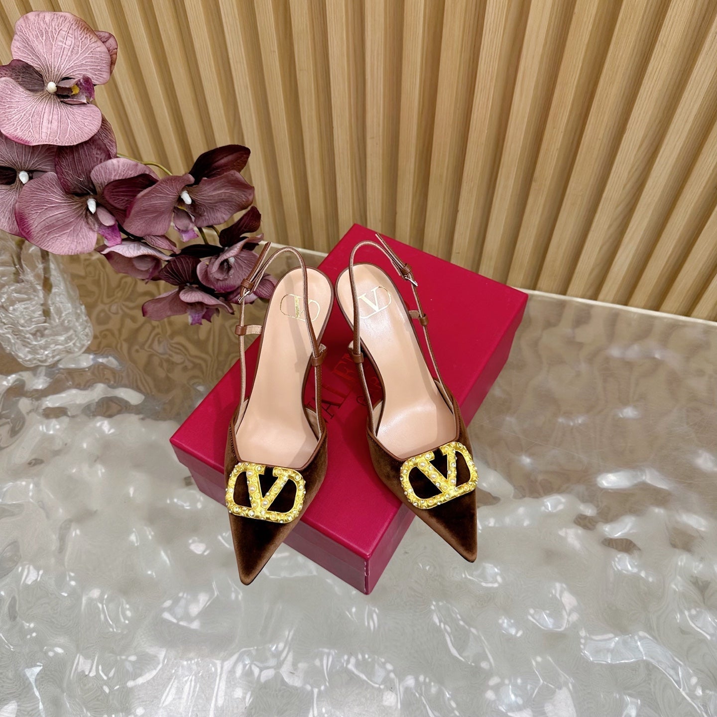 VALENTINO 25S HIGH-HEEL SLINGBACKS IN DARK BROWN VELVET WITH GOLD HARDWARE