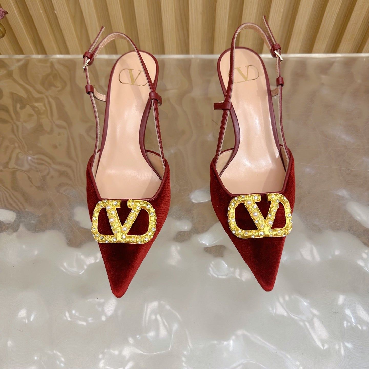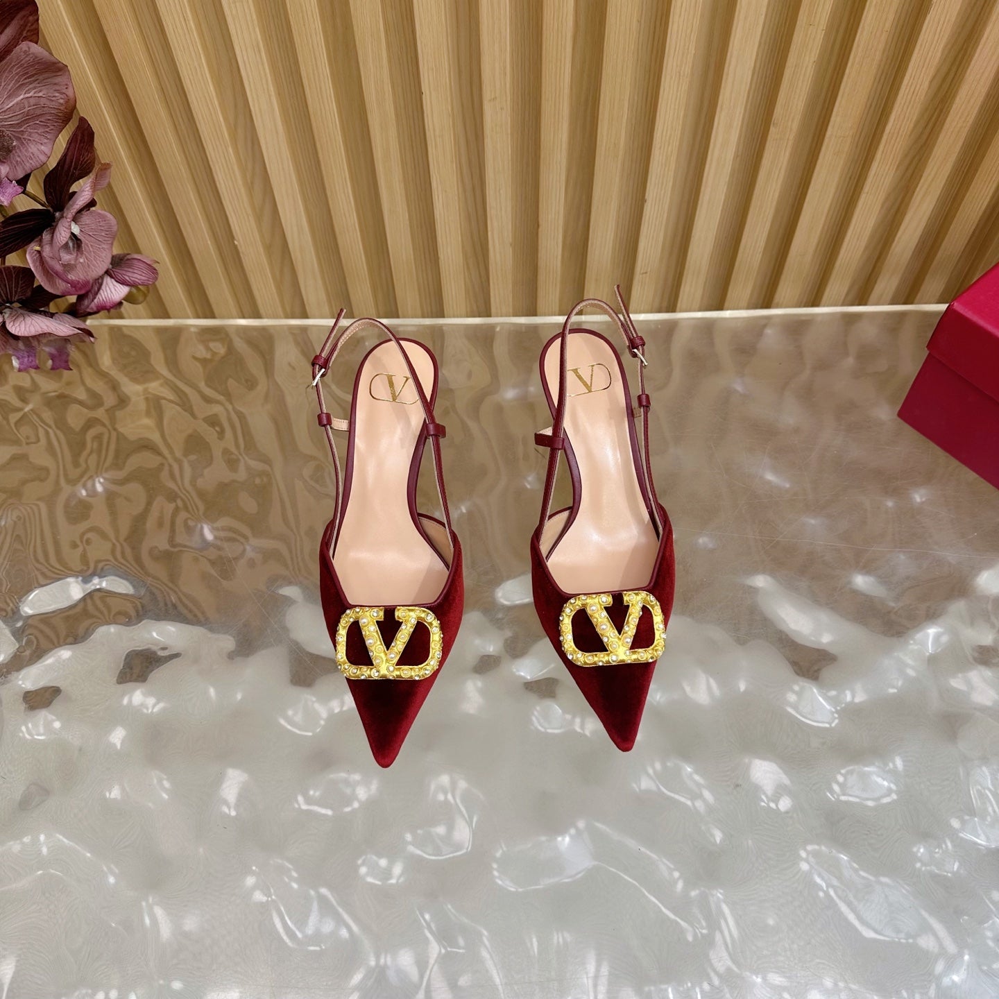 VALENTINO 25S HIGH-HEEL SLINGBACKS IN DARK RED VELVET WITH GOLD HARDWARE