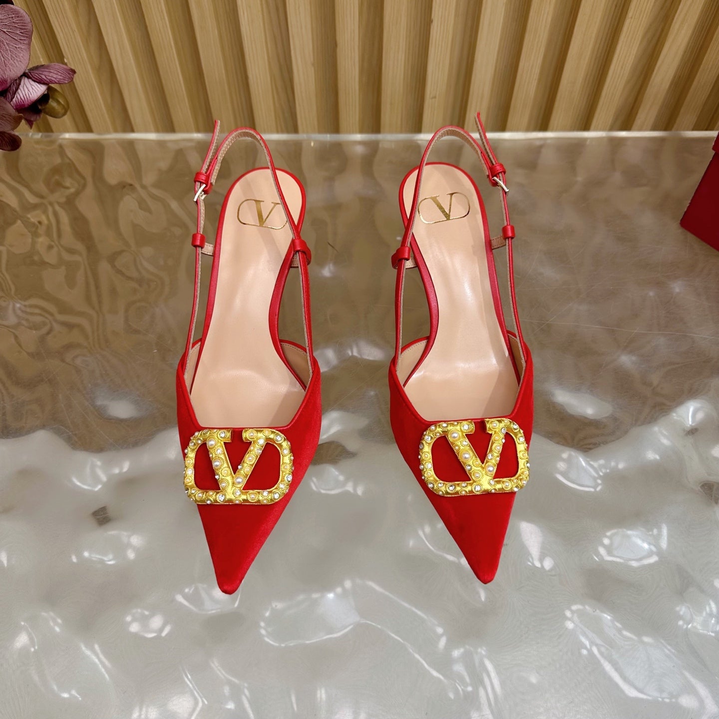 VALENTINO 25S HIGH-HEEL SLINGBACKS IN RED VELVET WITH GOLD HARDWARE