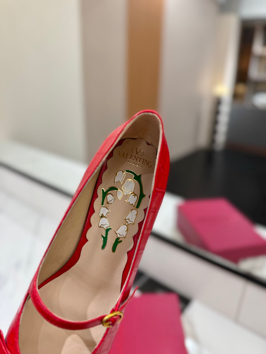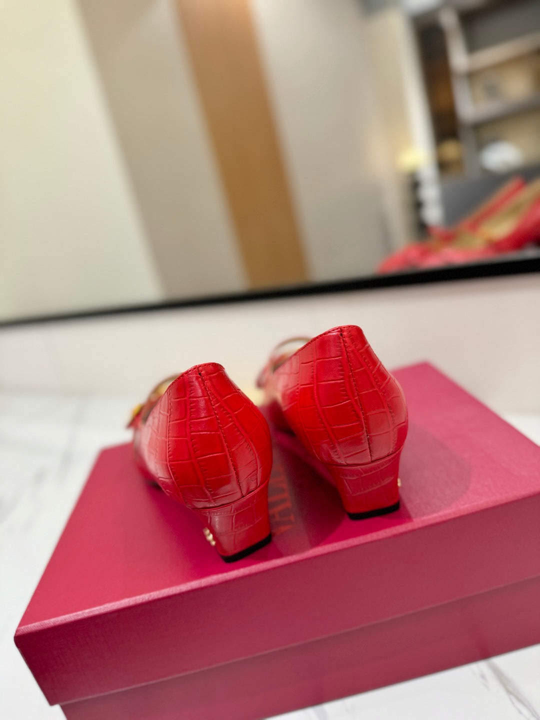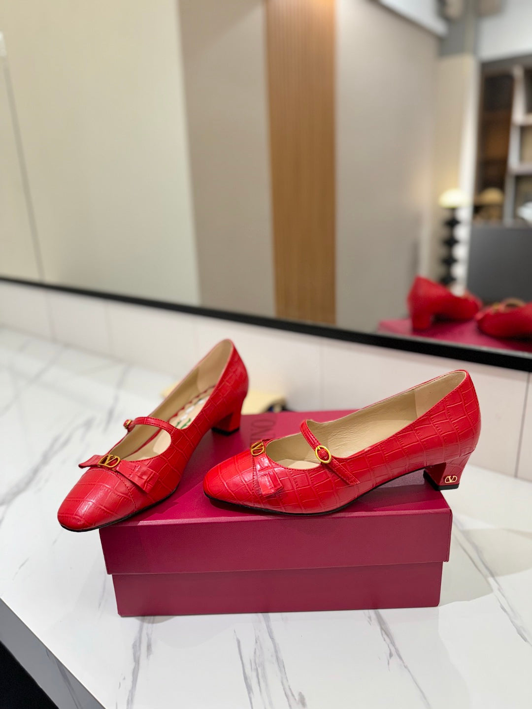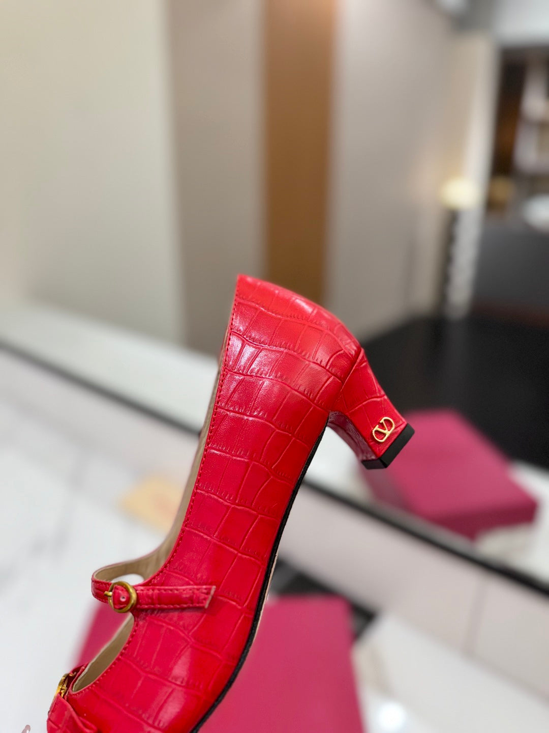 VLTN VLOGO SIGNATURE ROUND-TOE HEELS 25S IN RED LAMBSKIN SNAKE-EMBOSSED