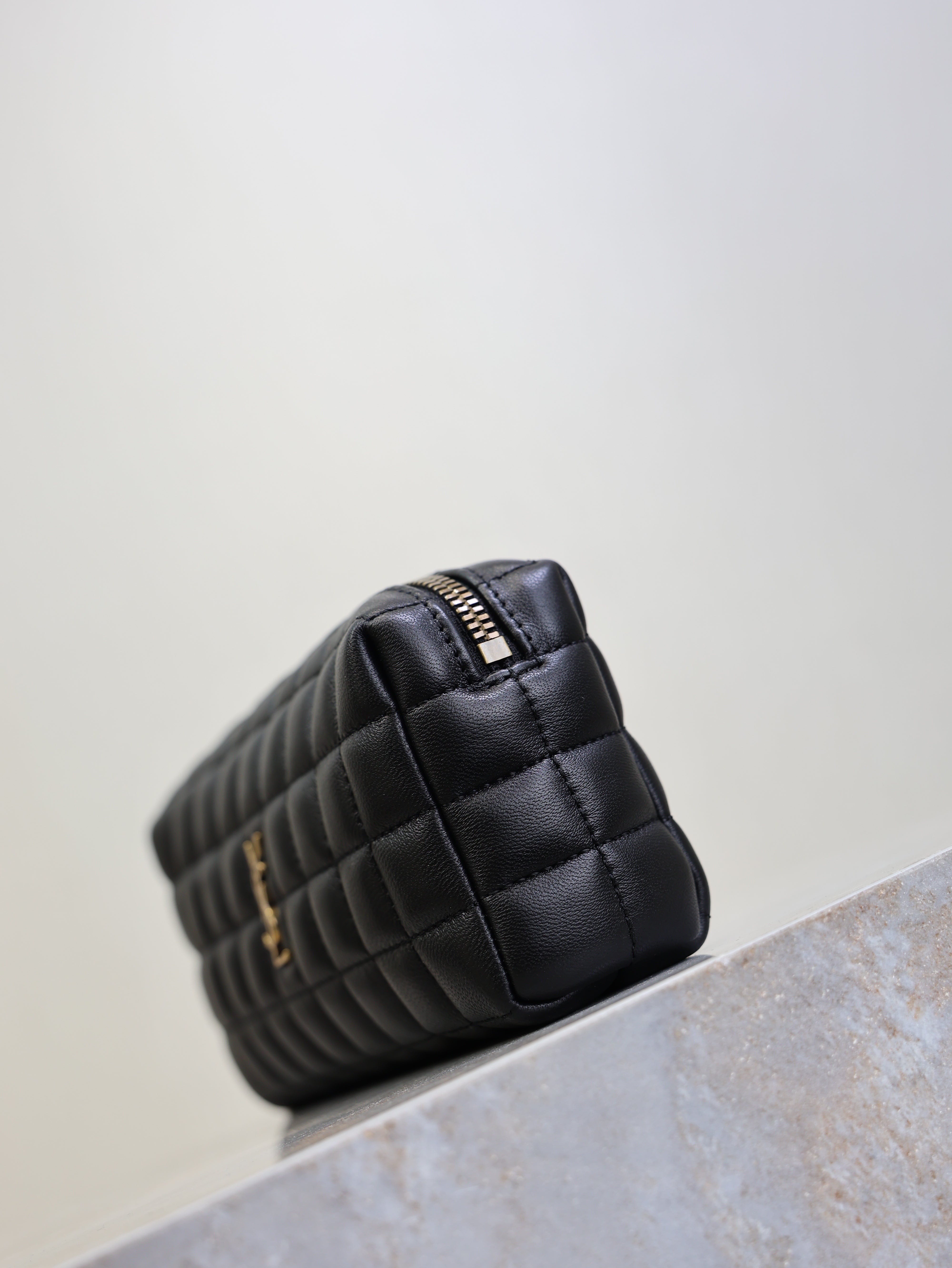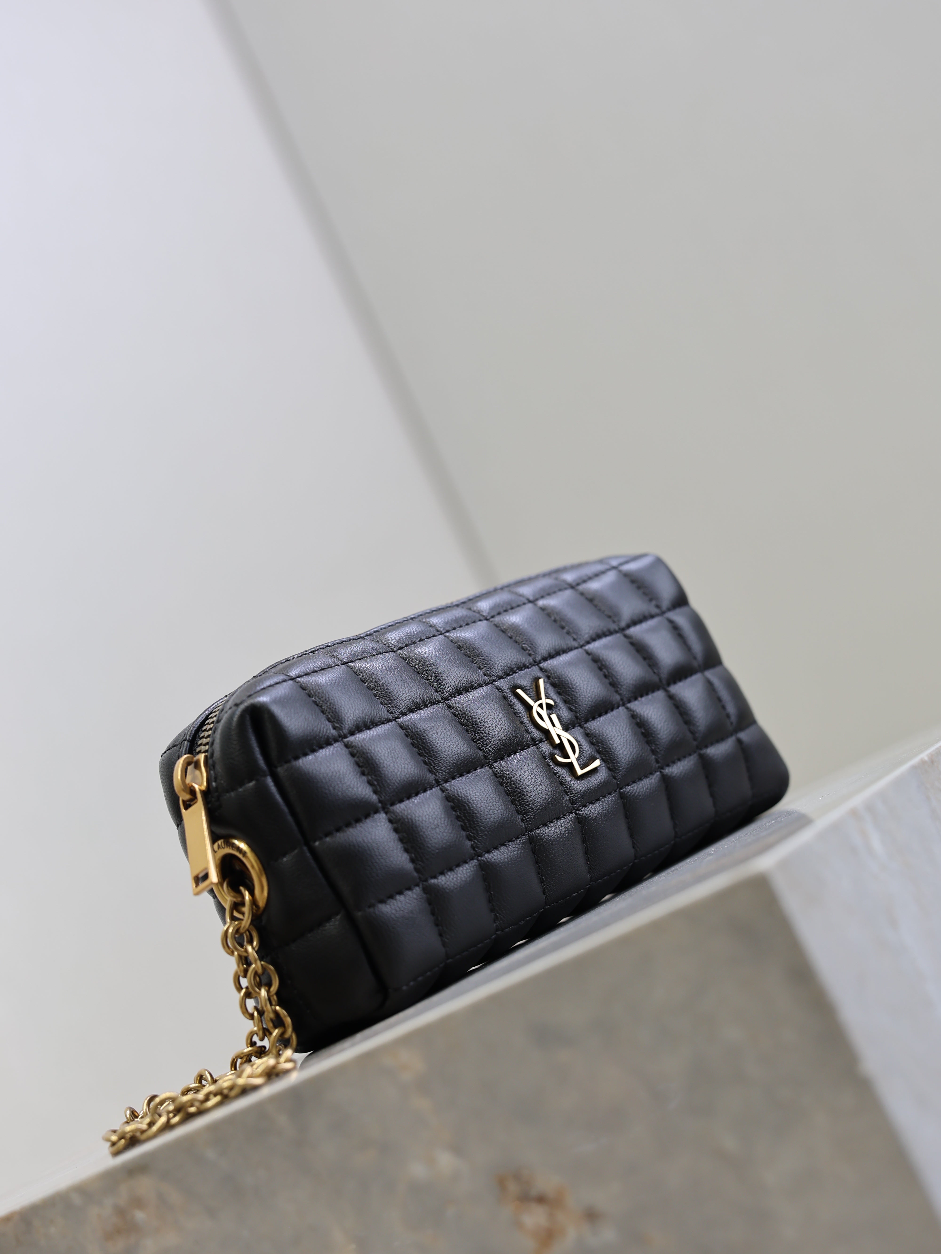 YSL 25S CASSANDRE MATELASSÉ CARRÉ POUCH ON CHAIN 18 IN BLACK LAMBSKIN
