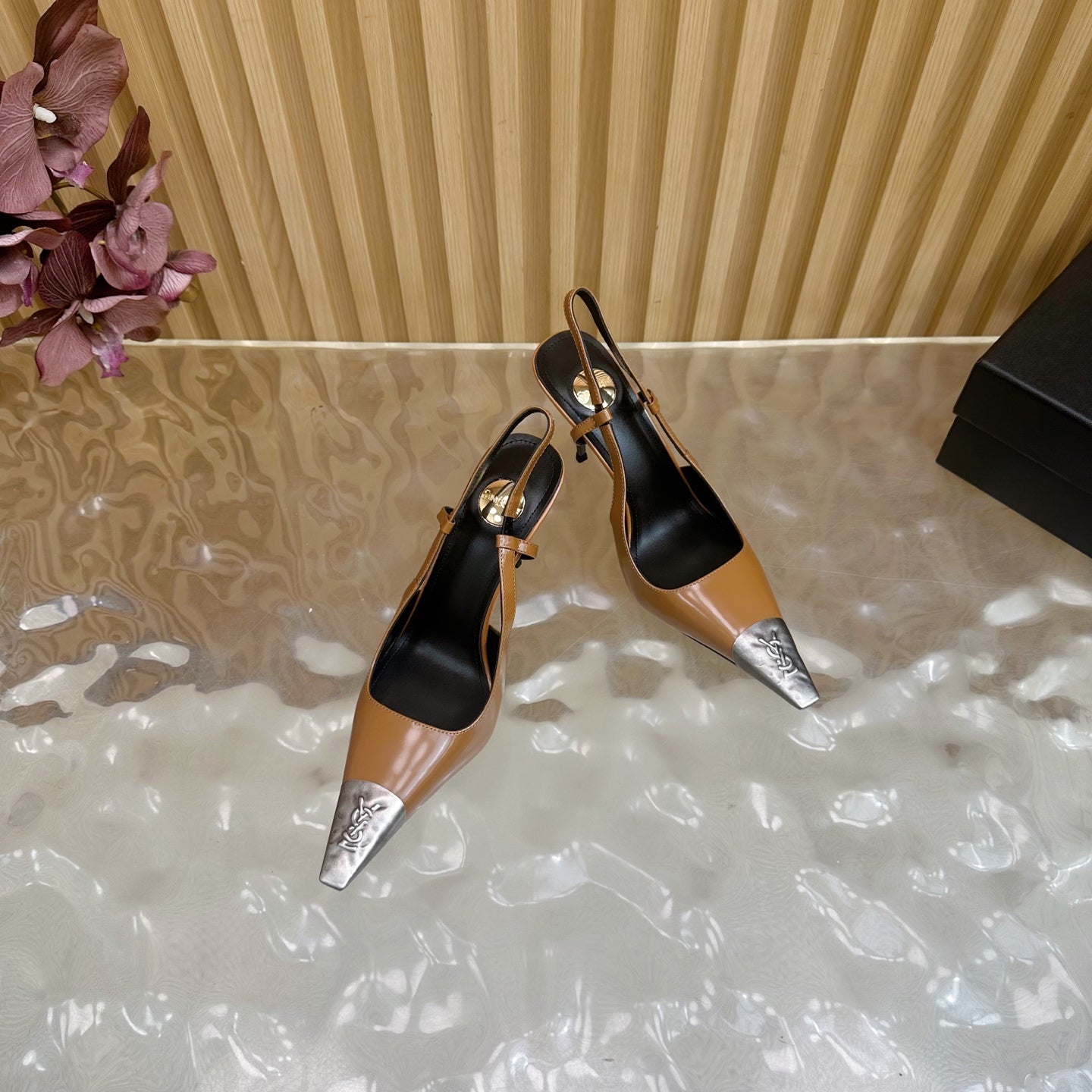 YSL 25S HIGH-HEEL SLINGBACKS 105 MM IN CAMEL BROWN LAMBSKIN AND SILVER HARDWARE