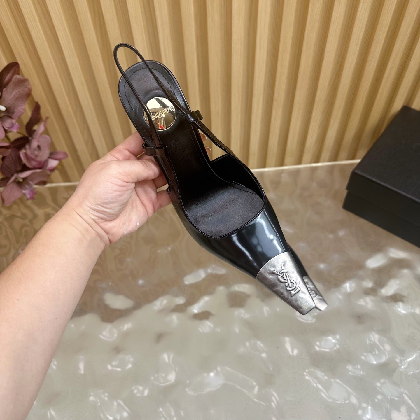 YSL 25S HIGH-HEEL SLINGBACKS 85 MM IN BLACK SHINY LAMBSKIN AND SILVER HARDWARE