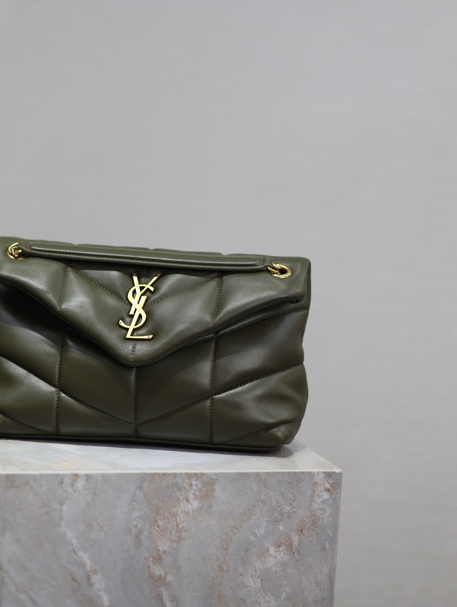 YSL 25S LOULOU PUFFER MM 29 IN DARK OLIVE CALFSKIN GOLD HARDWRE