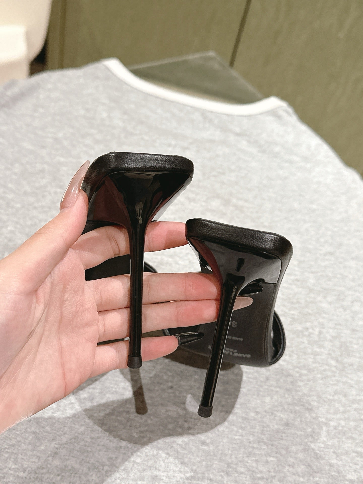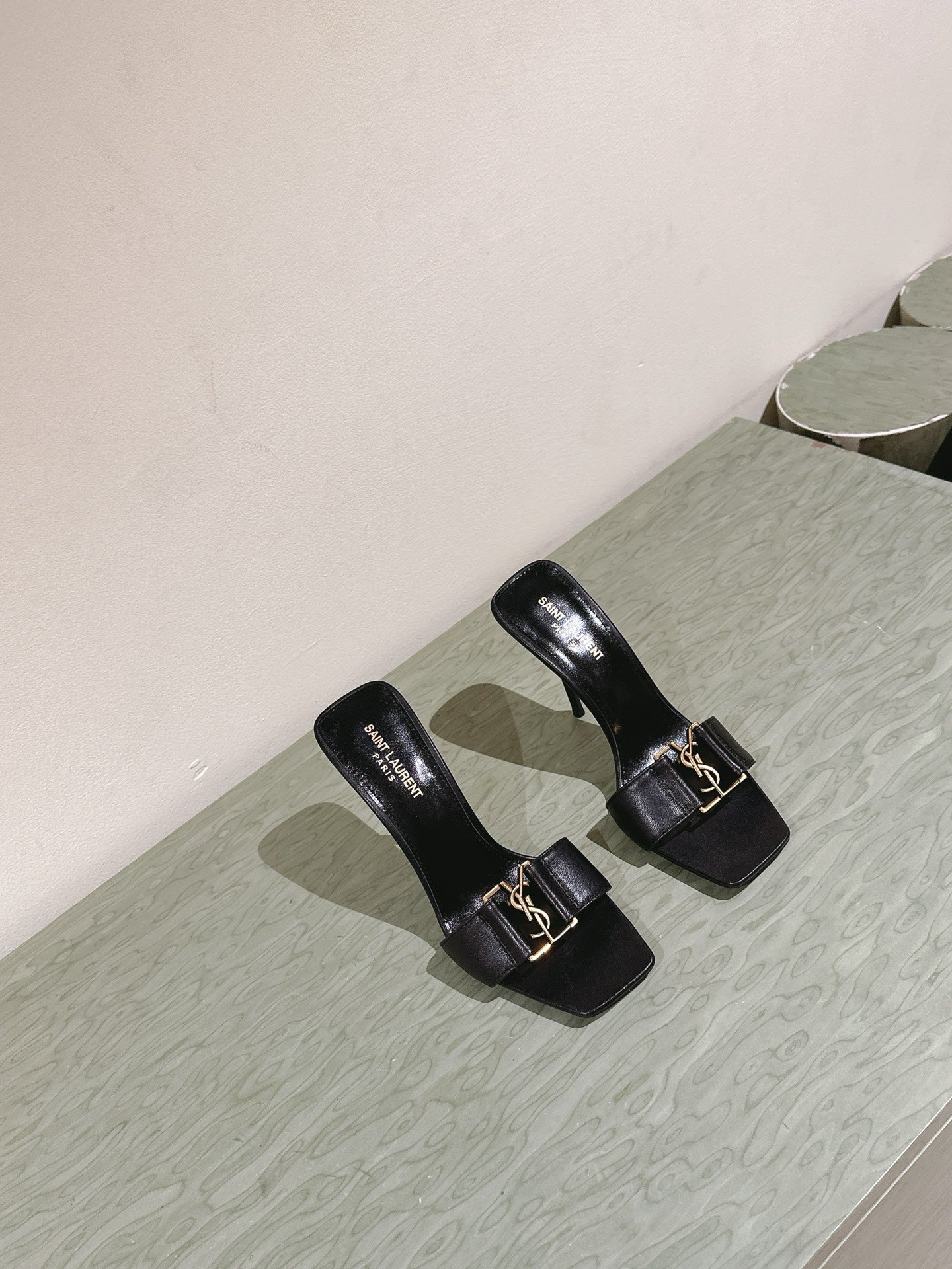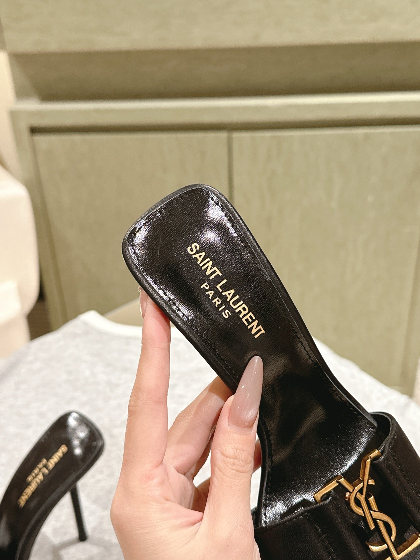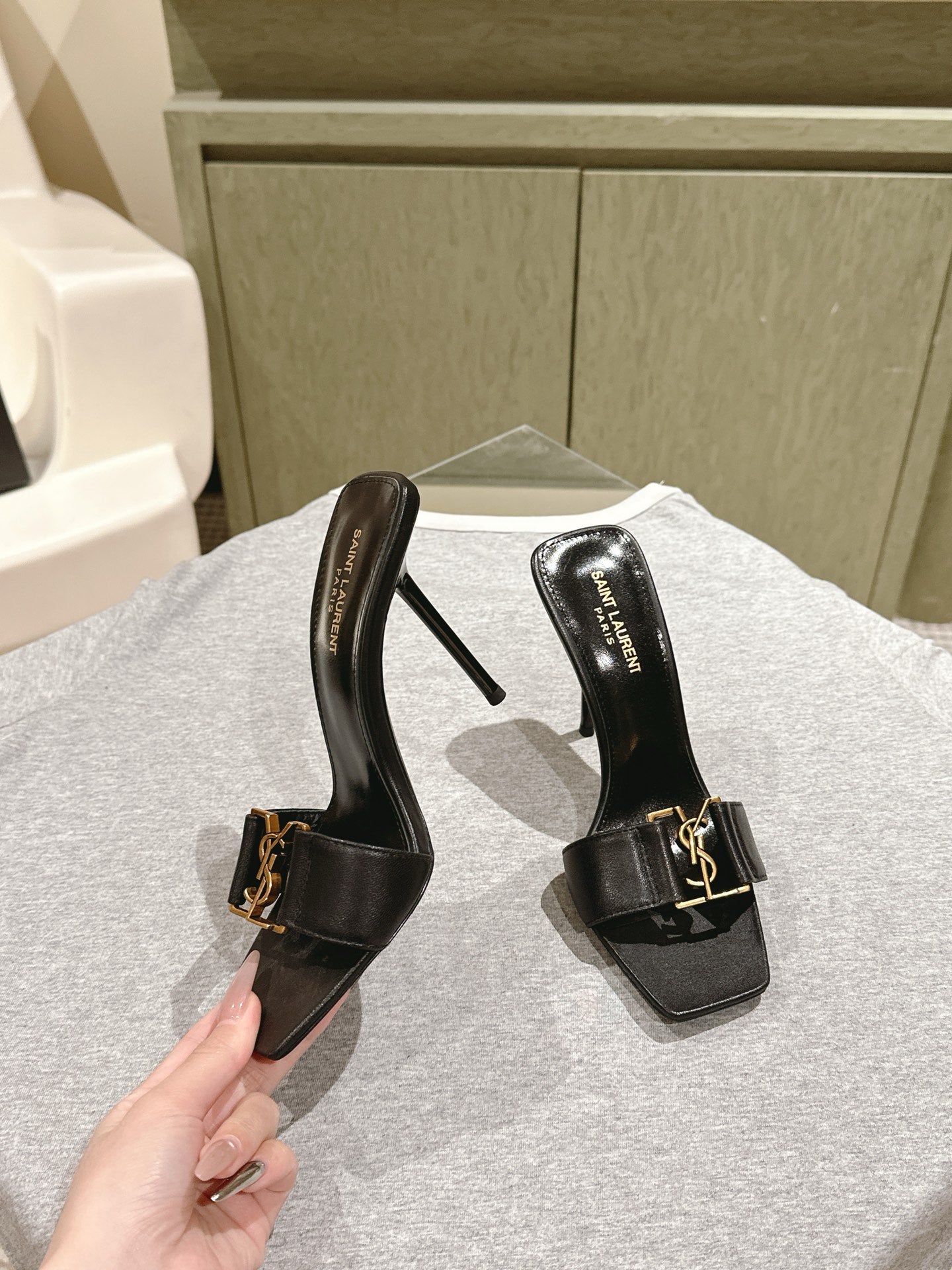 YSL 25S SQUARE-TOE HIGH-HEEL SANDALS 100 MM IN BLACK LAMBSKIN WITH GOLD HARDWARE